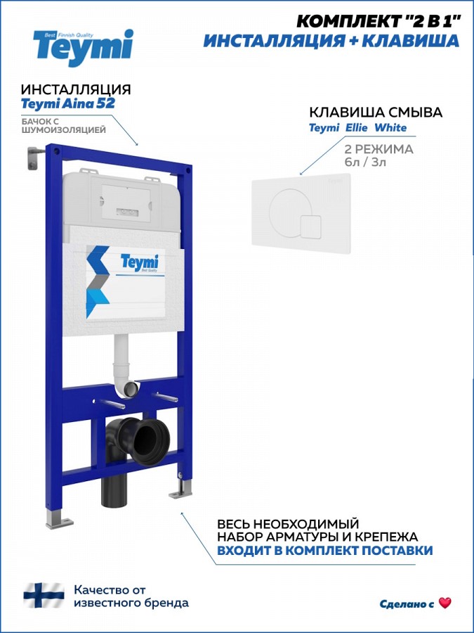 -- инсталляция TEYMI AINA 52 T70011 – монтажная рама из стального профиля толщиной 1.5 мм увеличенной ширины 52,5 см с дополнительными вертикальными усиливающими стойками, что позволяет выдерживать нагрузки до 400 кг;