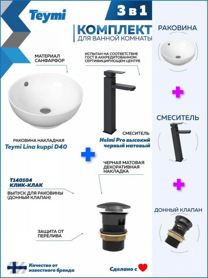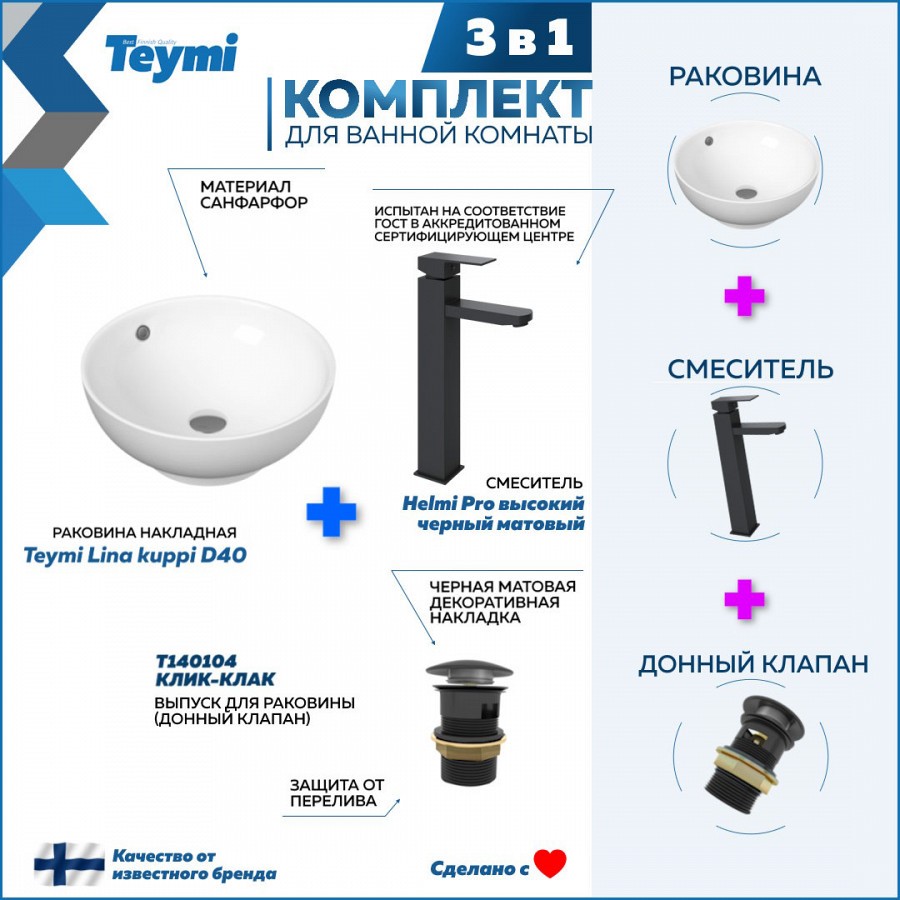 -- Наименование: Смеситель для раковины Teymi Helmi Pro высокий, черный матовый;