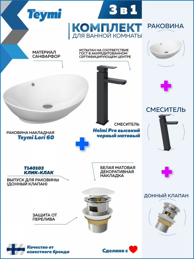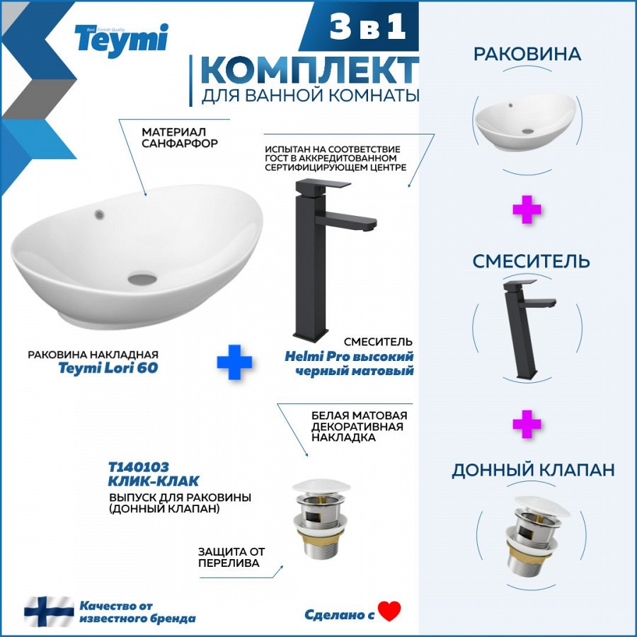-- Наименование: Смеситель для раковины Teymi Helmi Pro высокий, черный матовый;