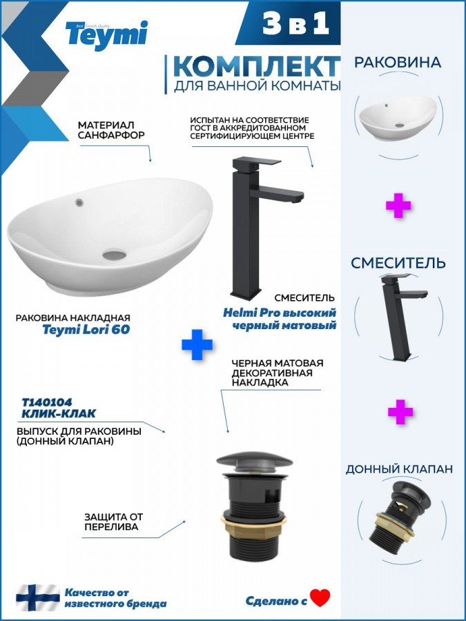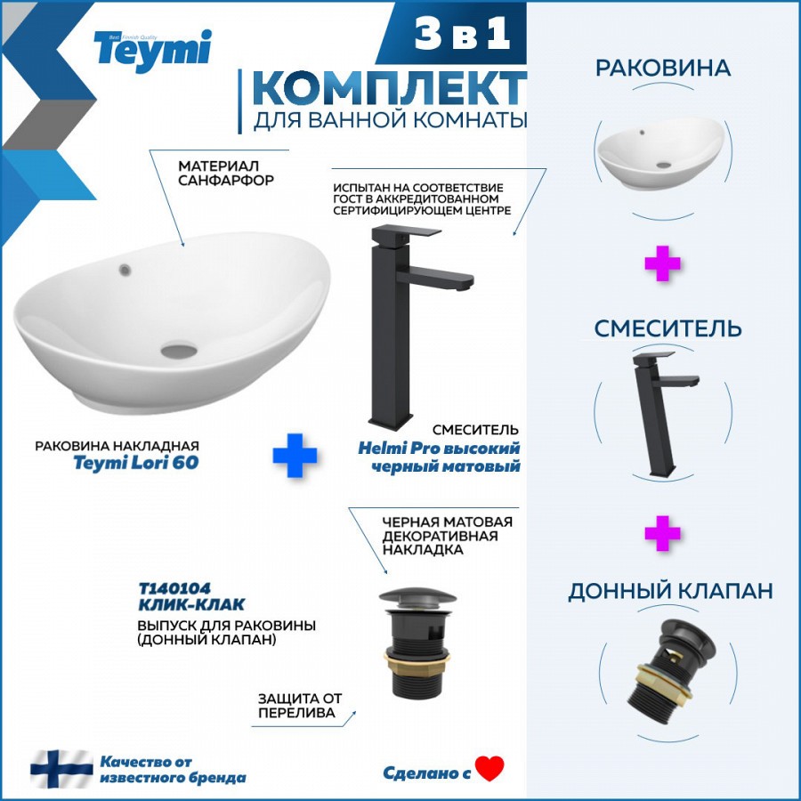 -- Наименование: Смеситель для раковины Teymi Helmi Pro высокий, черный матовый;