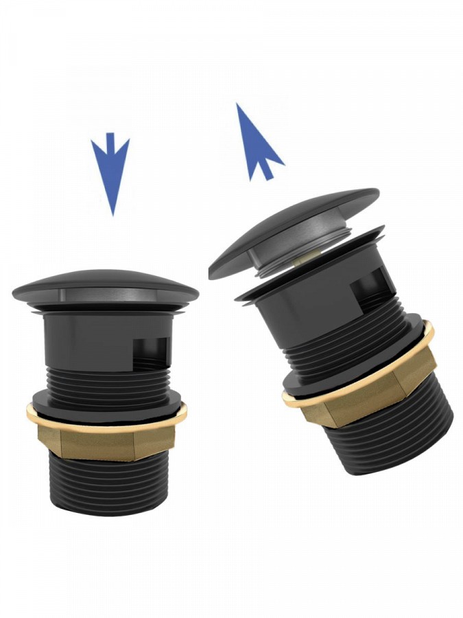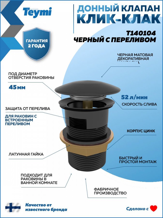 3. Донный клапан Teymi для раковины с переливом, черный.