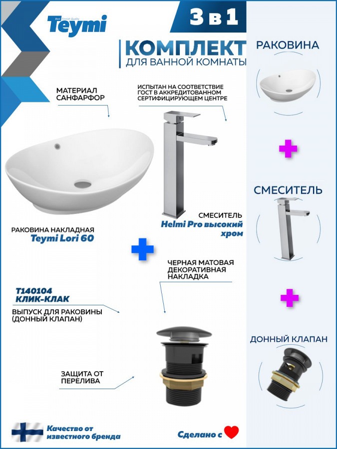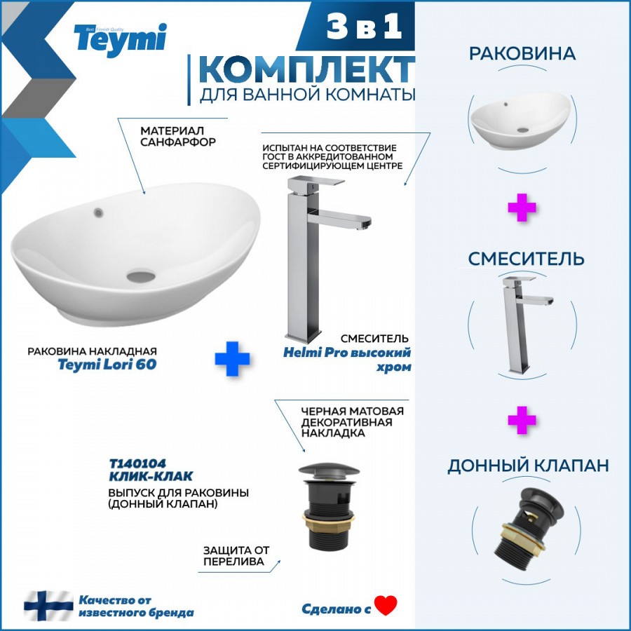1. Раковина накладная Teymi Lori 60, белая;