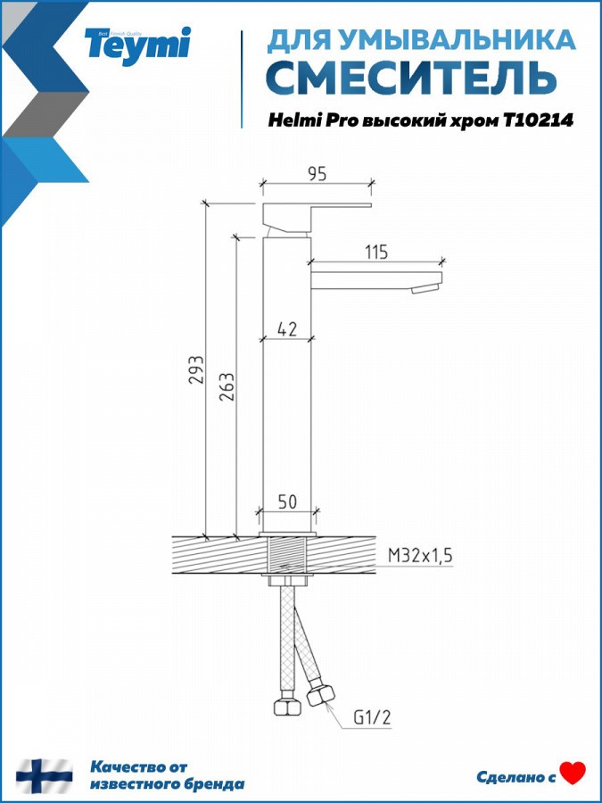 3. Смеситель для раковины Teymi Helmi Pro высокий, хром.