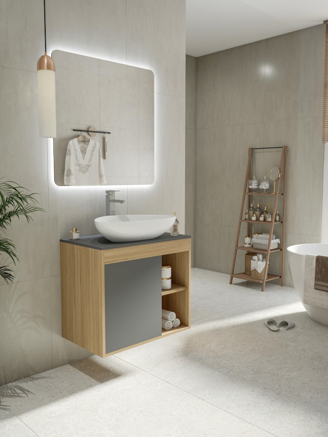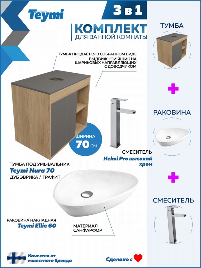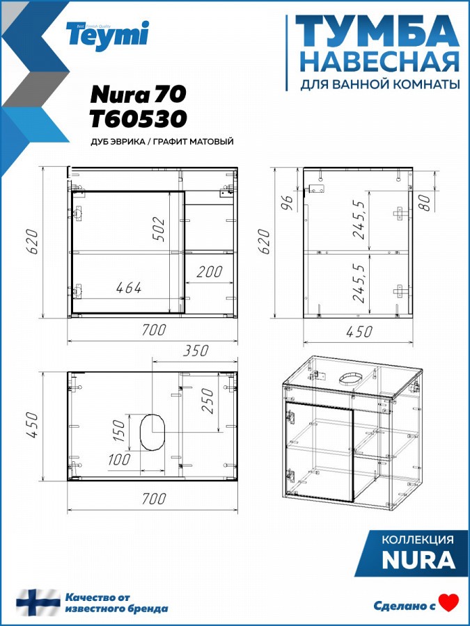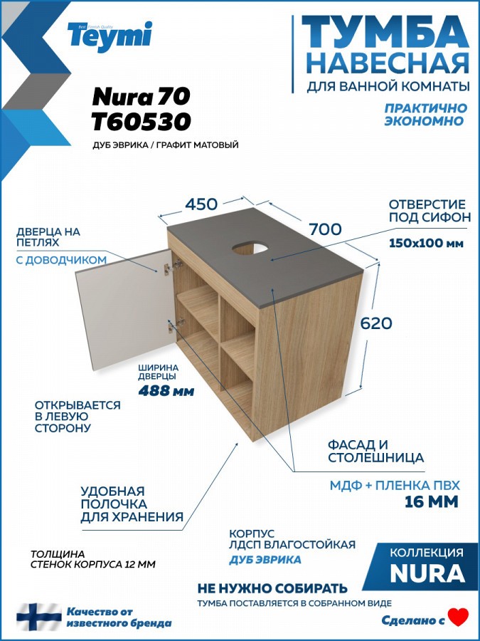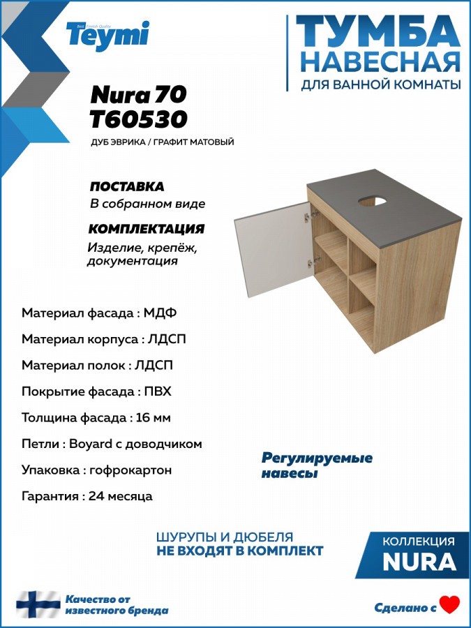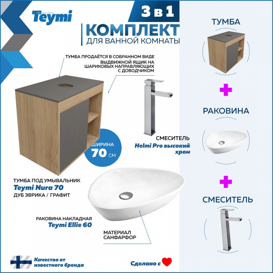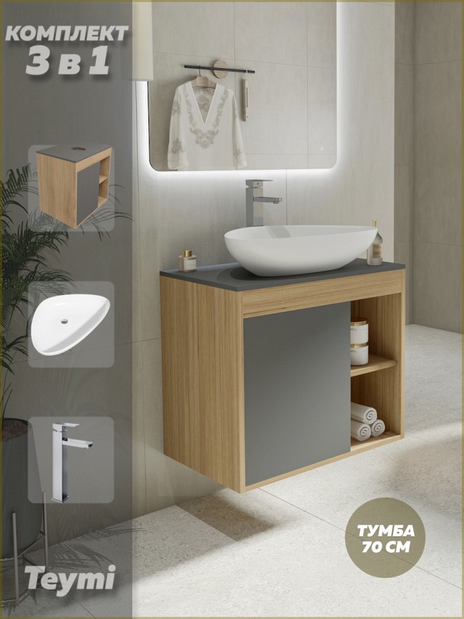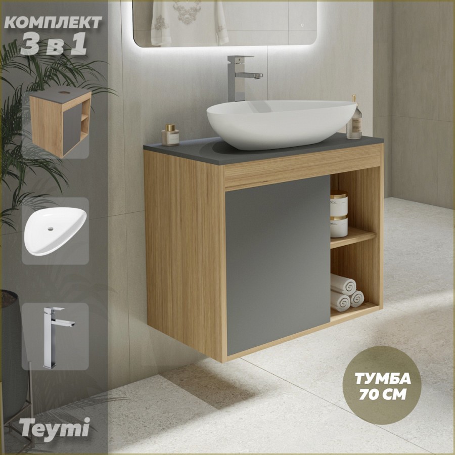 1. Тумба подвесная Teymi Nura 70, дуб эврика/графит матовый.