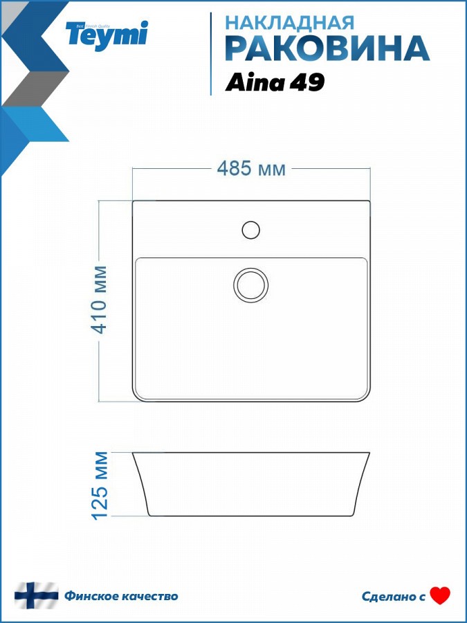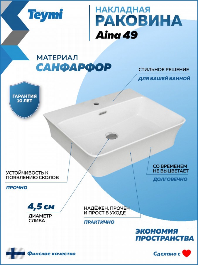 2. Раковина накладная Teymi Aina 49 с полочкой под смеситель, белая.