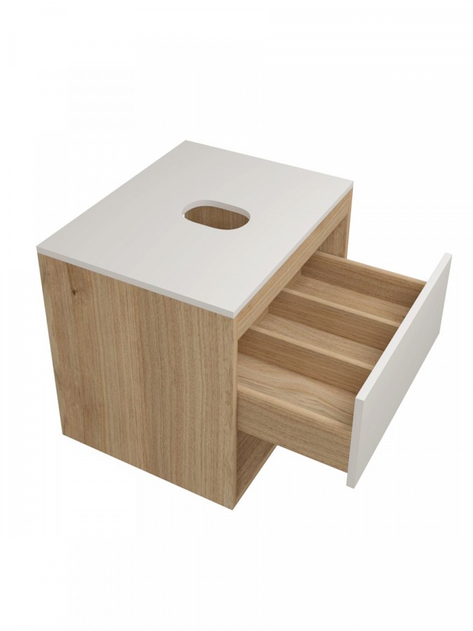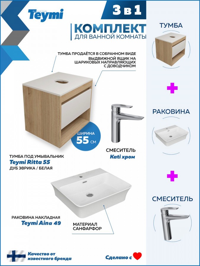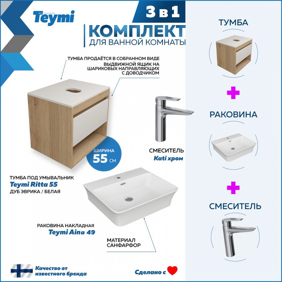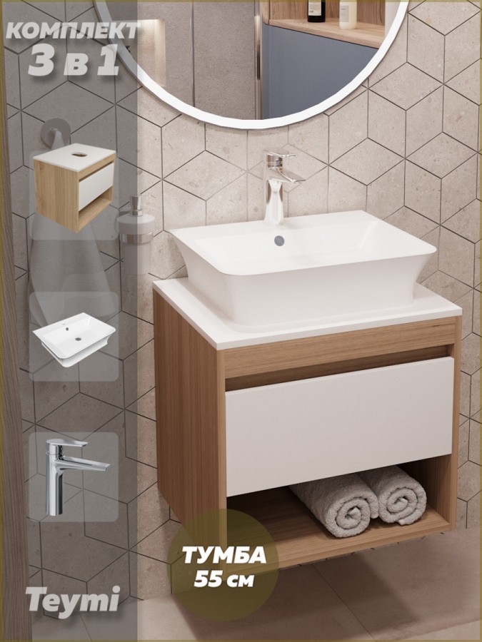 1. Тумба подвесная Teymi Ritta 55, ящик с доводчиком, цвет дуб эврика/белый матовый.