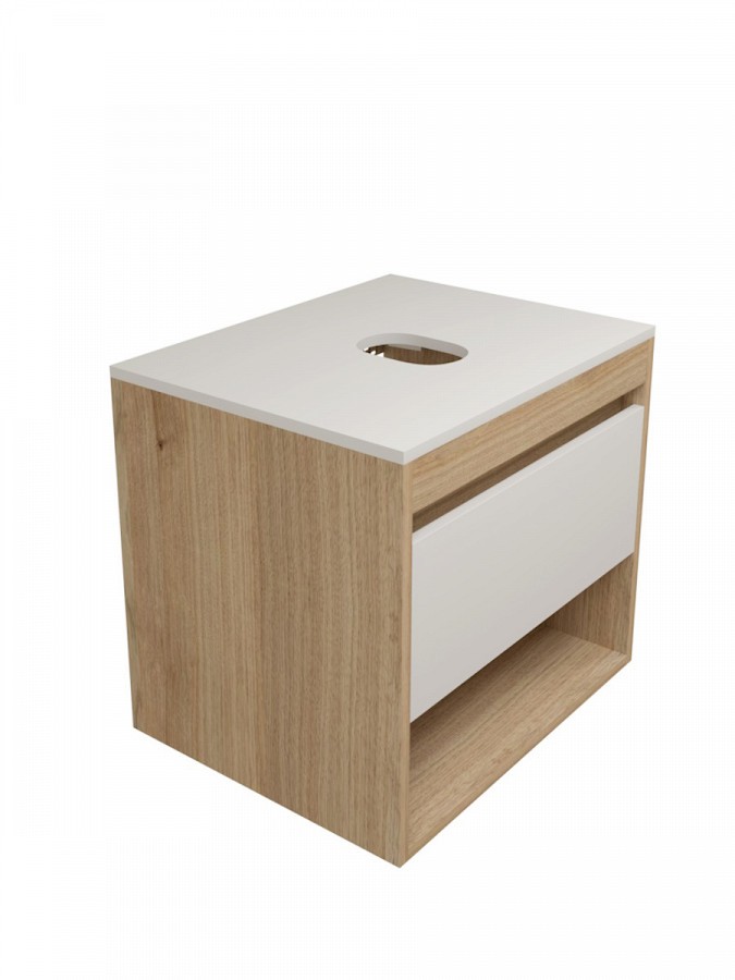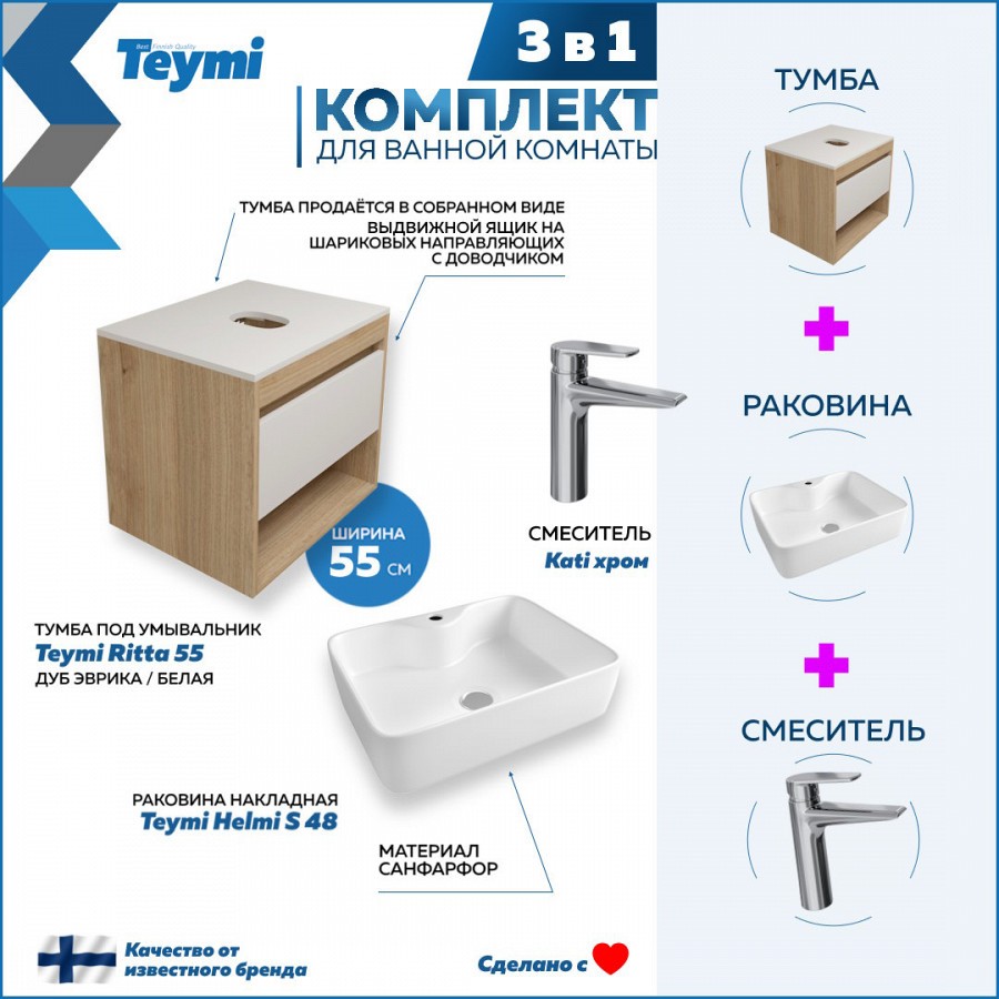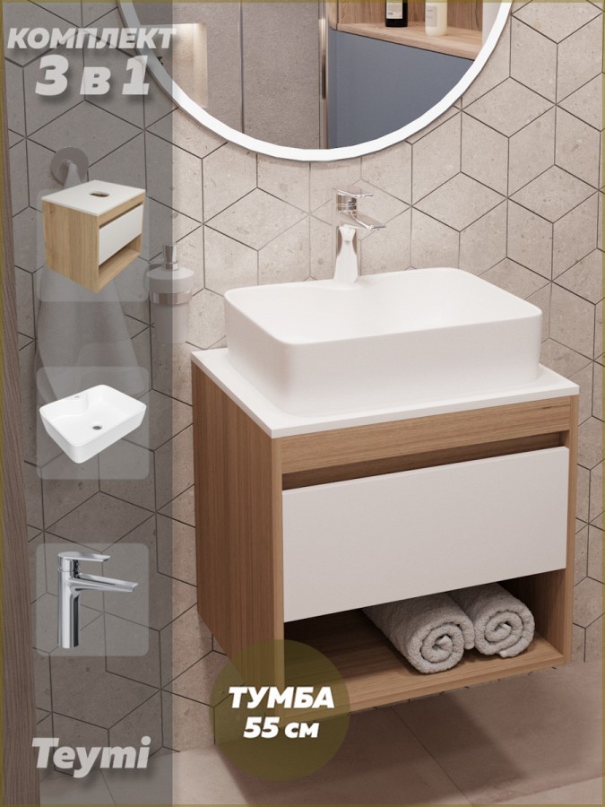 1. Тумба подвесная Teymi Ritta 55, ящик с доводчиком, цвет дуб эврика/белый матовый.