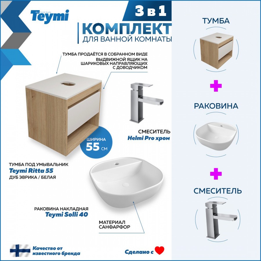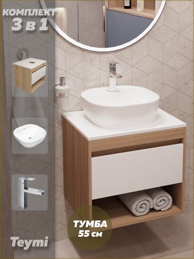 1. Тумба подвесная Teymi Ritta 55, ящик с доводчиком, цвет дуб эврика/белый матовый.