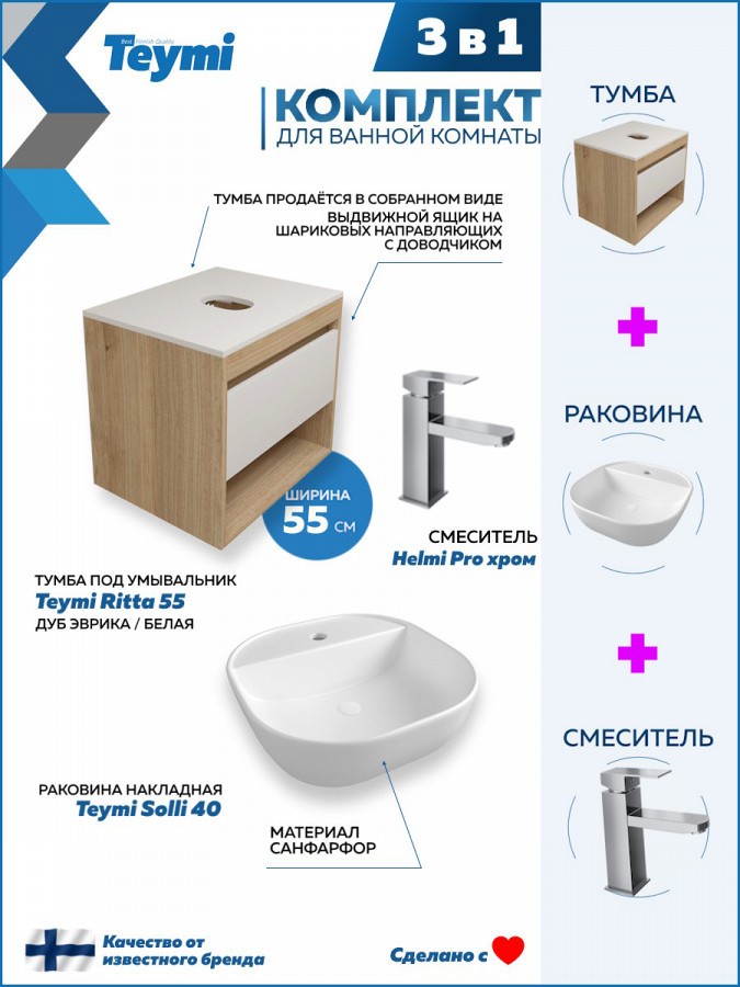 2. Раковина накладная Teymi Solli 40 белая.