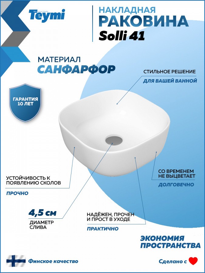2. Раковина накладная Teymi Solli 41 artceramic, белая.