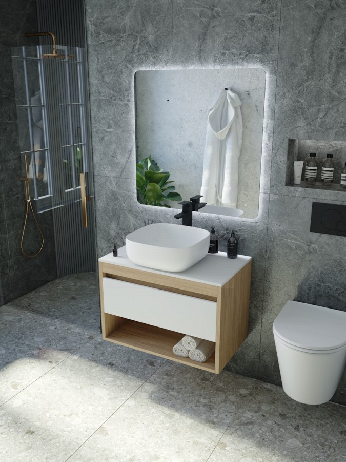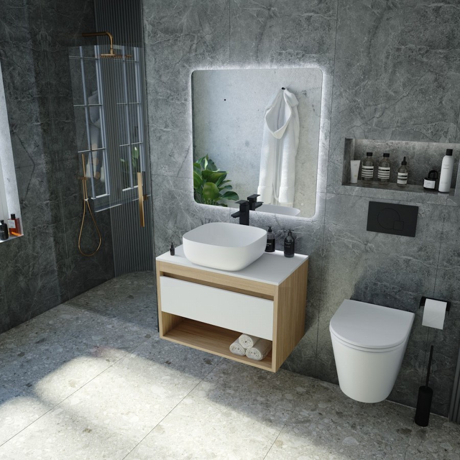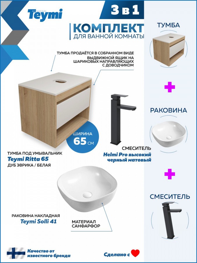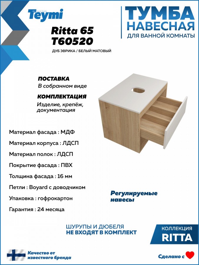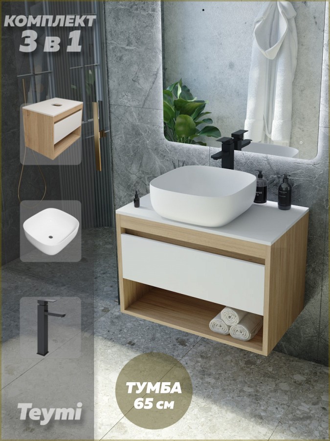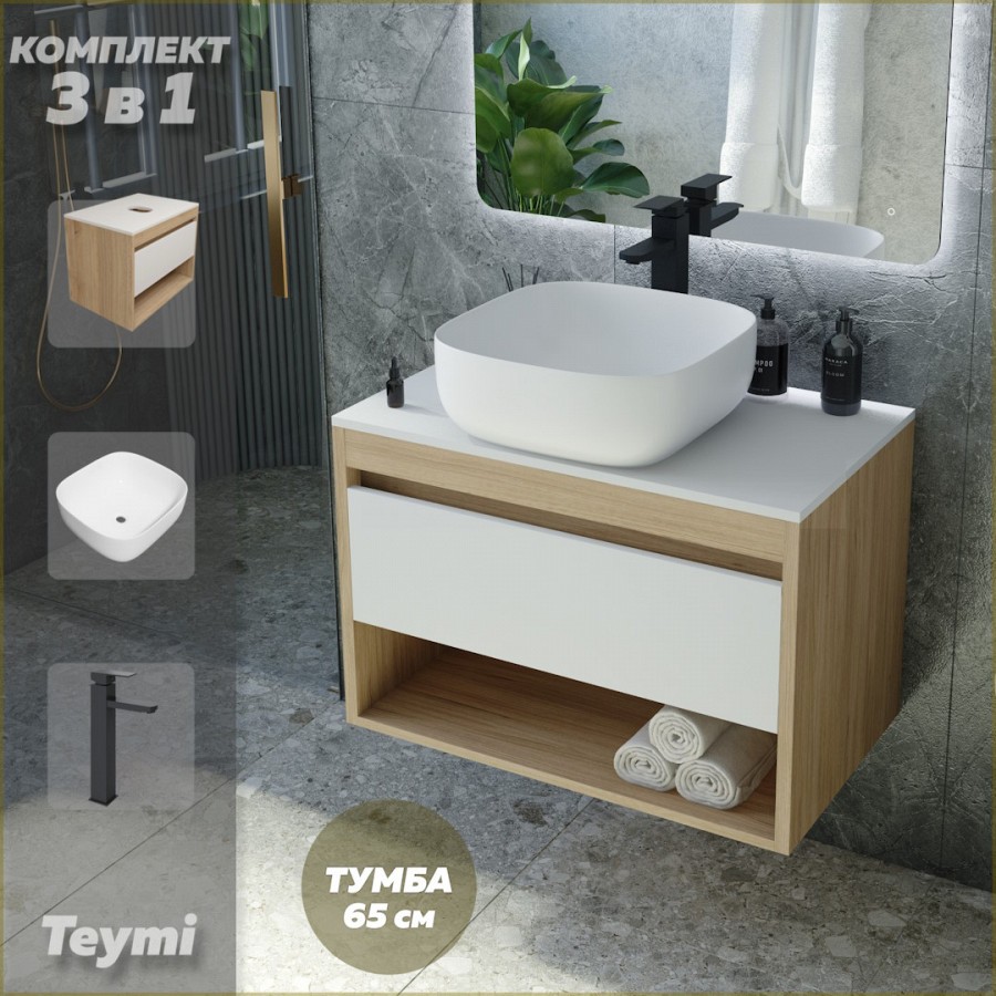 1. Тумба подвесная Teymi Ritta 65, ящик сдоводчиком, цвет дуб эврика/белый матовый.