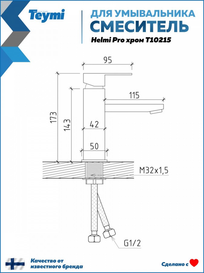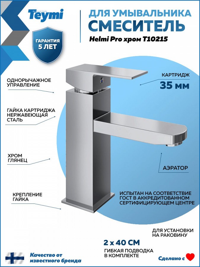3. Смеситель для раковины Teymi Helmi Pro, хром.