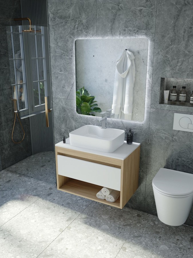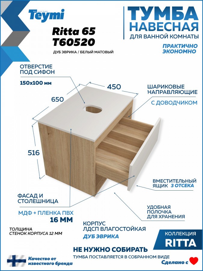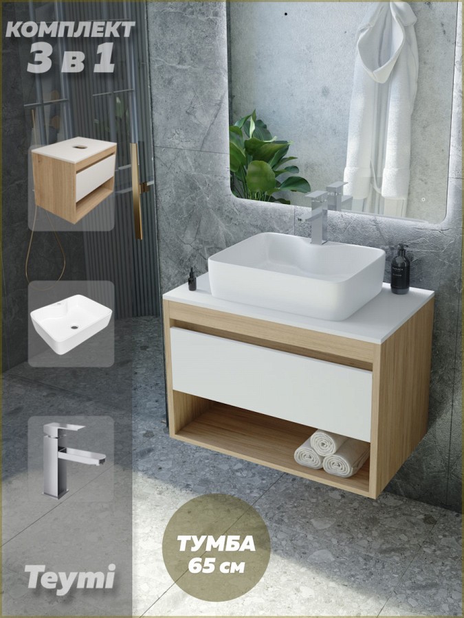 1. Тумба подвесная Teymi Ritta 65, ящик сдоводчиком, цвет дуб эврика/белый матовый.