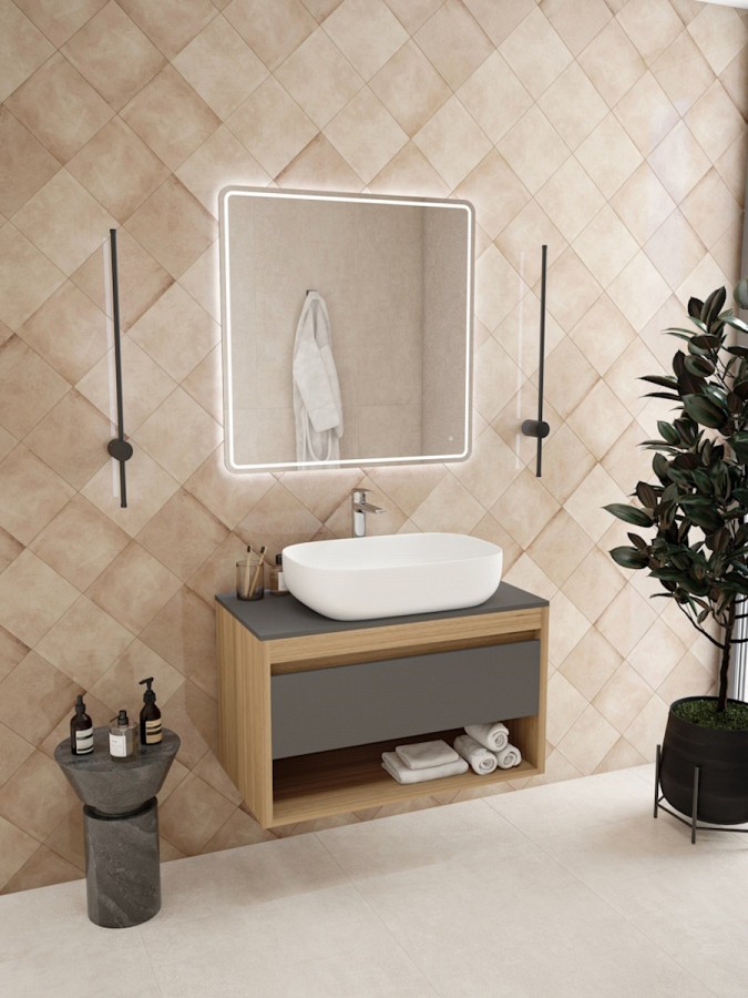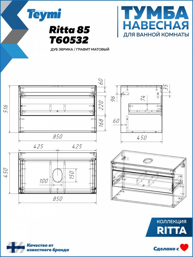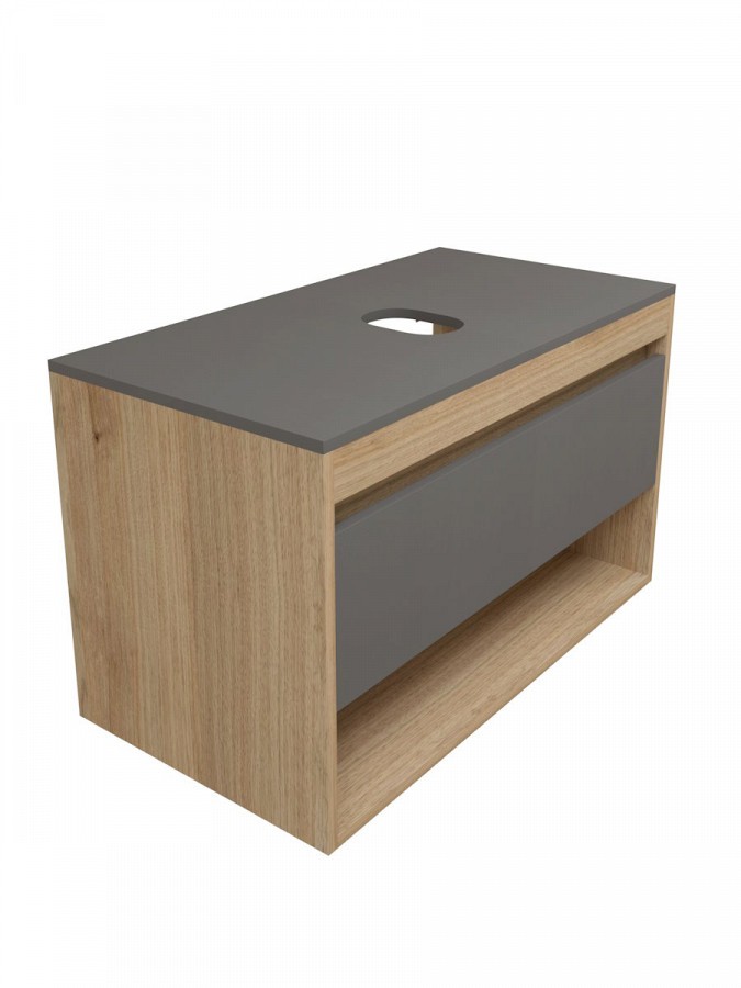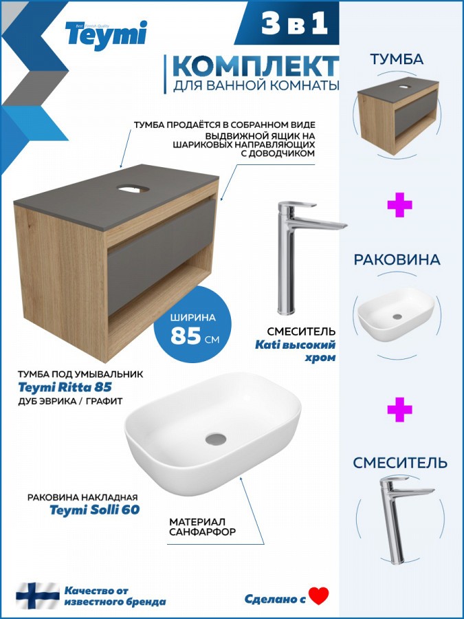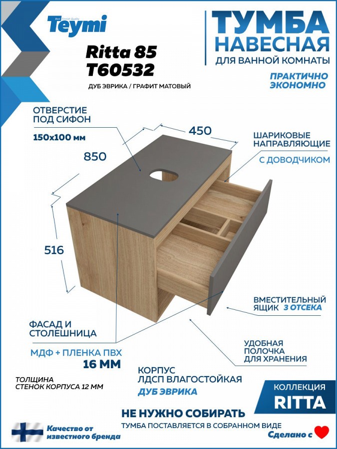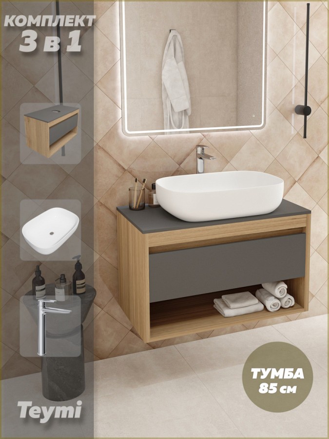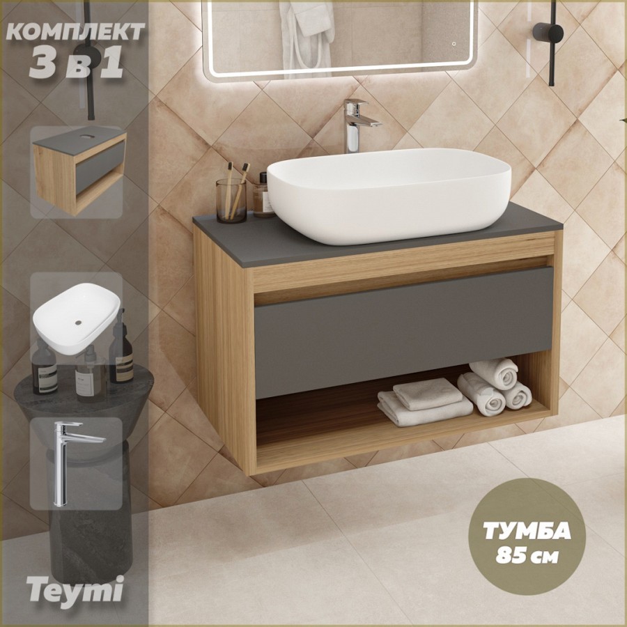 1. Тумба подвесная Teymi Ritta 85, ящик с доводчиком, цвет дуб эврика/графит матовый.