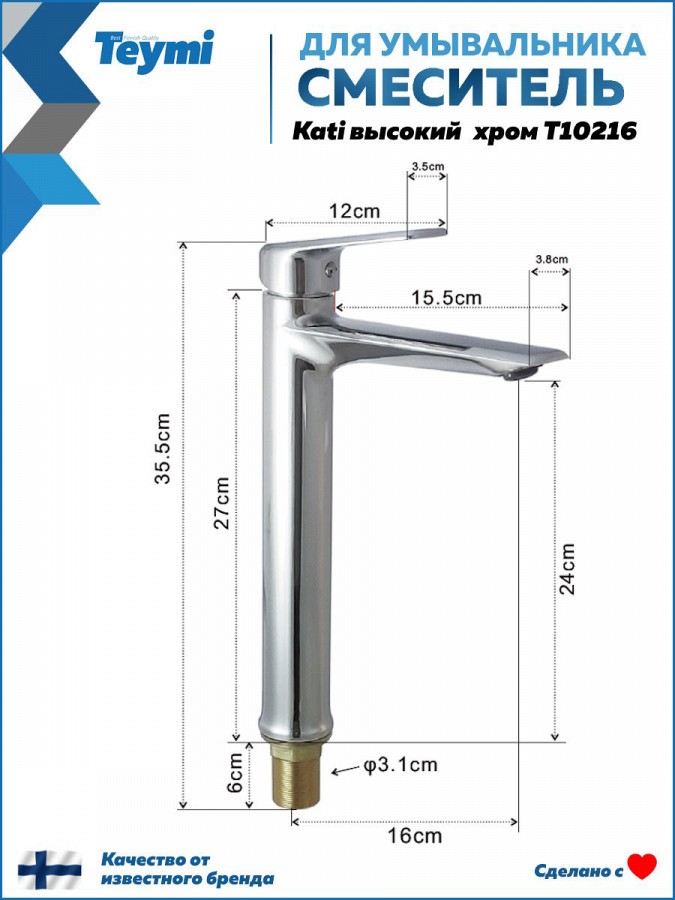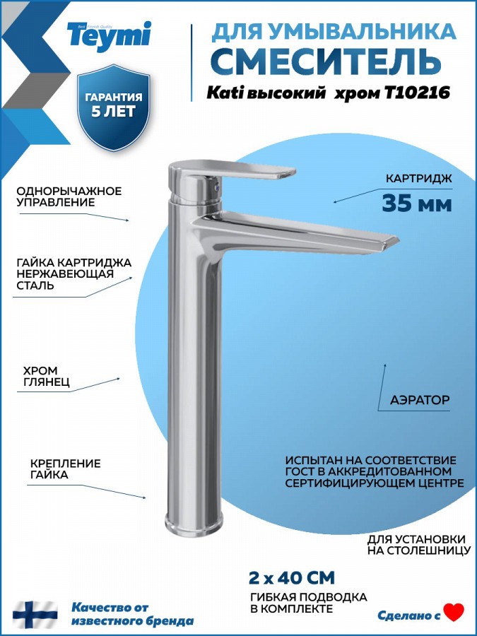 3. Смеситель для раковины Teymi Kati высокий, хром.