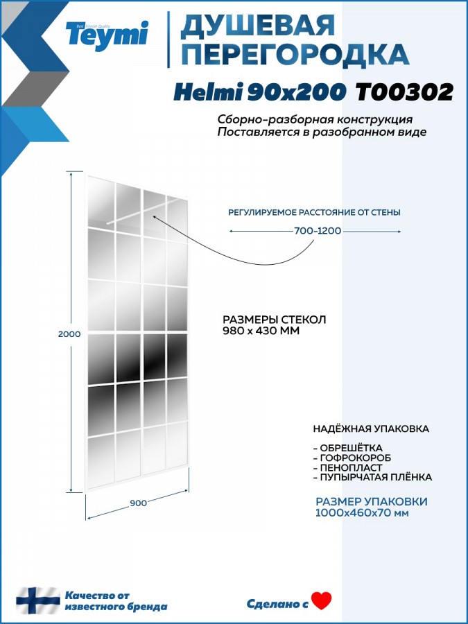 Душевая перегородка Teymi Helmi 90x200 см T00302 – это идеальное душевое ограждение, которое обеспечит комфорт и стильный внешний вид вашей душевой зоне.