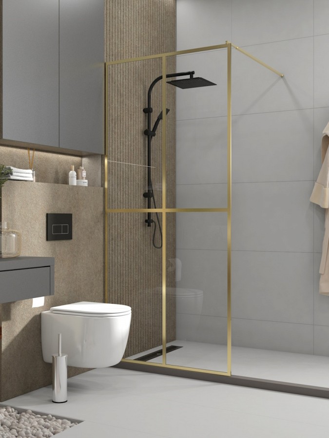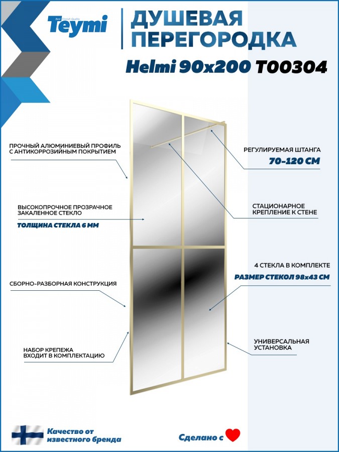 Душевая перегородка Teymi Helmi 90x200 см — это стильное и функциональное решение для оформления современной душевой. Выполненная в лаконичном дизайне с золотистым матовым профилем, она придаёт интерьеру элегантность и подчёркивает современные тенденции в оформлении помещений.