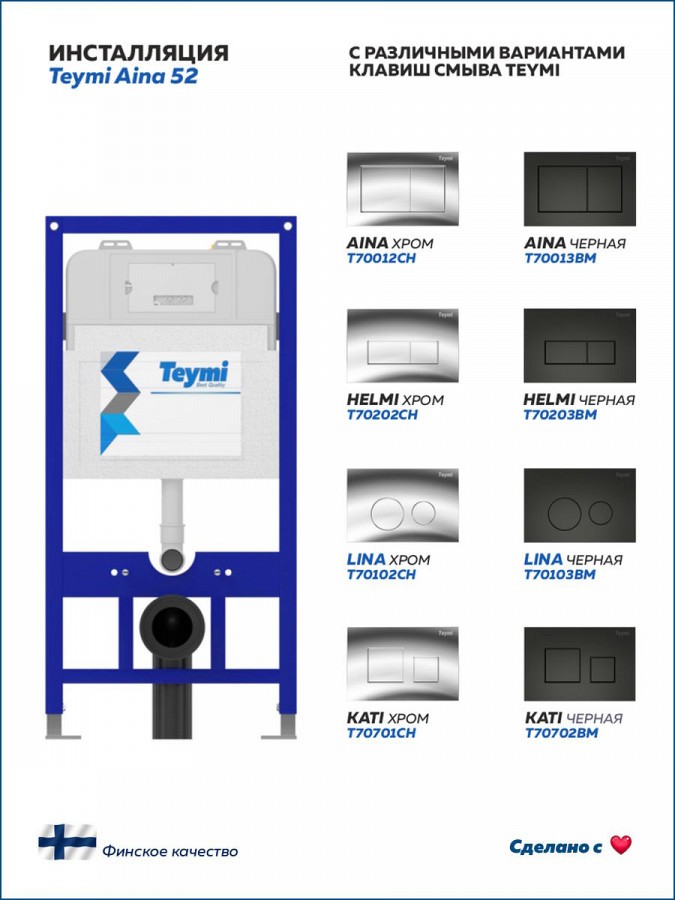 обращаем ваше внимание на то, что система инсталляции TEYMI AINA 52 может быть также укомплектована другими клавишами смыва или подвесными унитазами от бренда TEYMI (вы можете найти их на этом сайте по указанным артикулам).