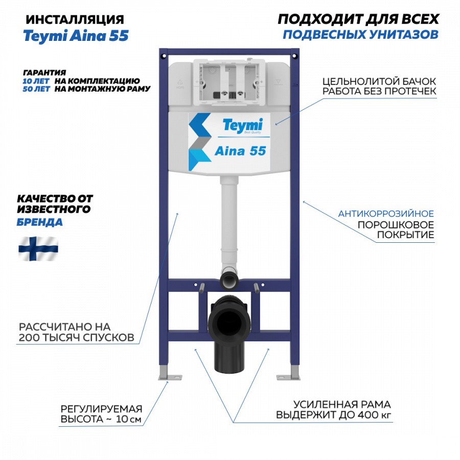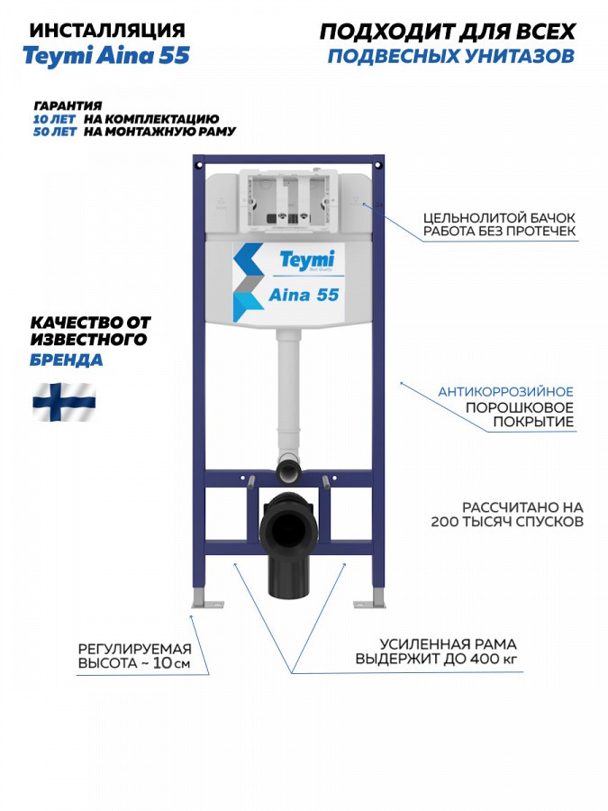 -- инсталляция TEYMI AINA 55 T70035 – монтажная рама из цельного стального профиля прямоугольного сечения, позволяющая выдерживать нагрузки до 400 кг. Габаритная ширина рамы 470 мм;