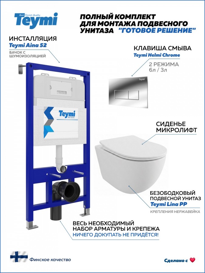 -- инсталляция TEYMI AINA 52 T70011 – монтажная рама из стального профиля толщиной 1.5 мм увеличенной ширины 52,5 см с дополнительными вертикальными усиливающими стойками, что позволяет выдерживать нагрузки до 400 кг;