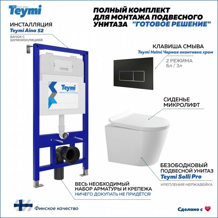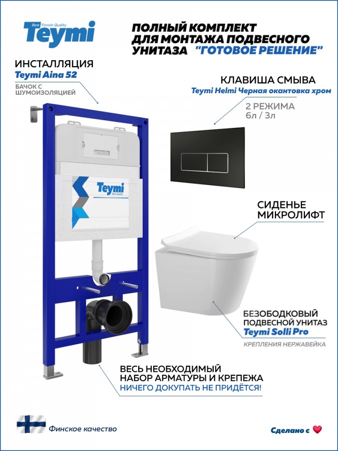 -- инсталляция TEYMI AINA 52 T70011 – монтажная рама из стального профиля толщиной 1.5 мм увеличенной ширины 52,5 см с дополнительными вертикальными усиливающими стойками, что позволяет выдерживать нагрузки до 400 кг;