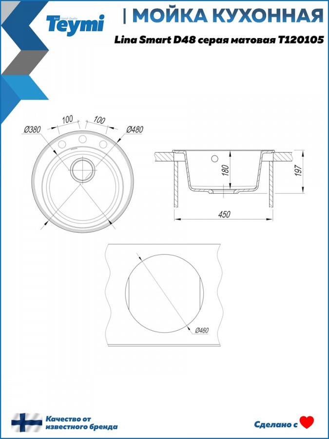 1. Мойка для кухни Teymi Lina Smart D48 круглая серая матовая T120105.