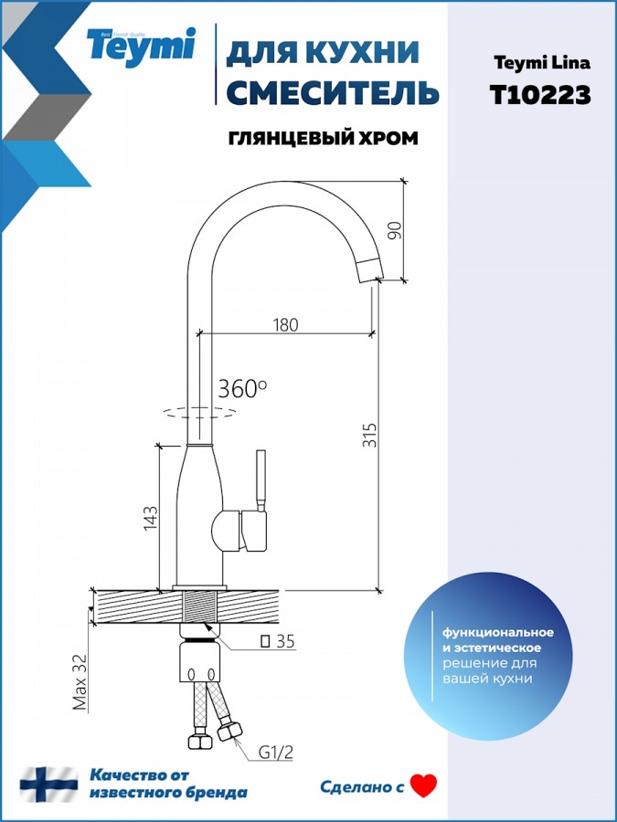 2. Смеситель для кухни Teymi Lina, хром T10223.