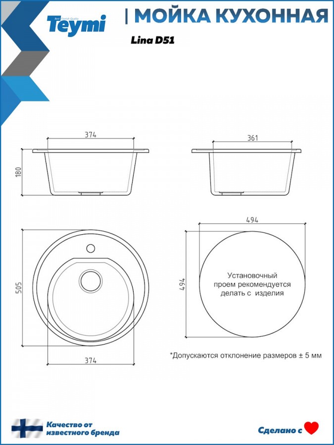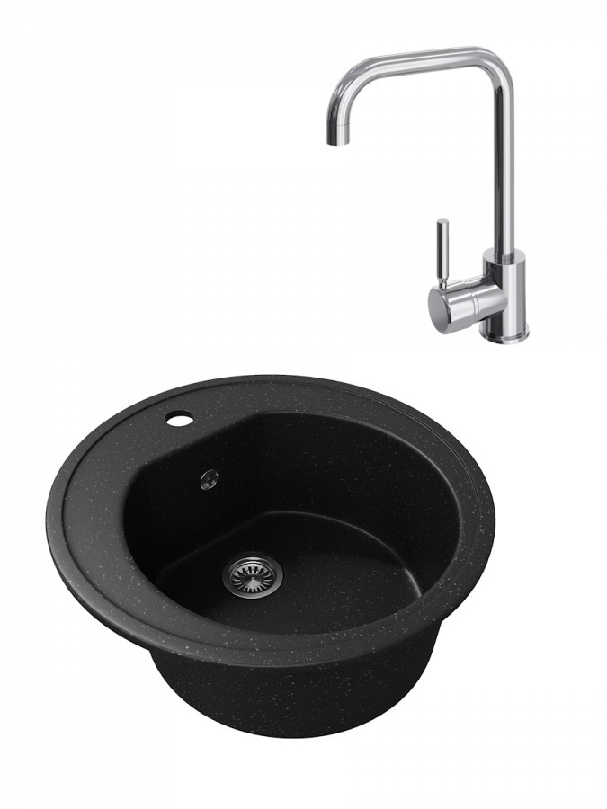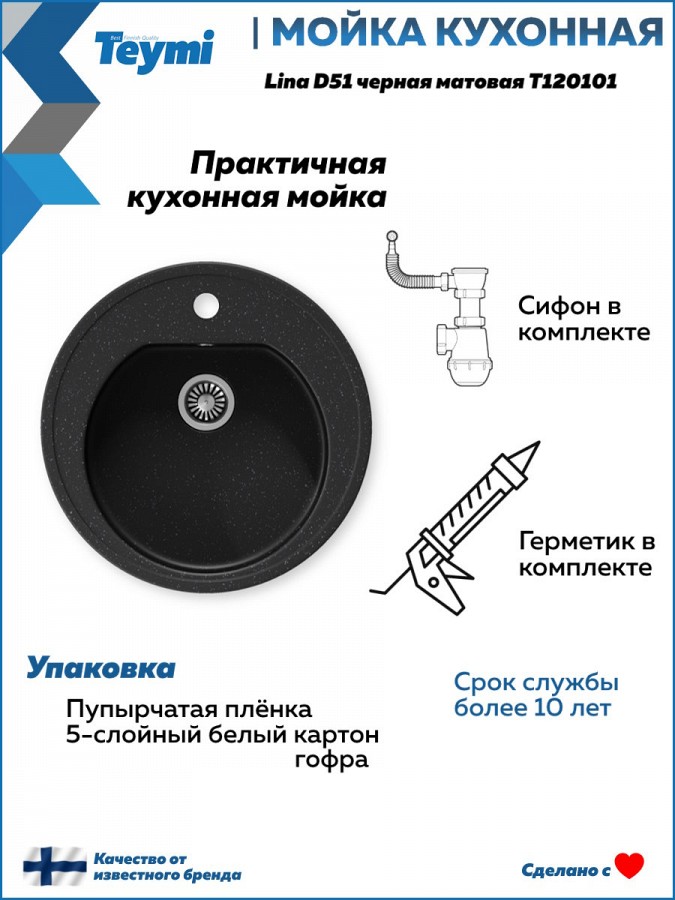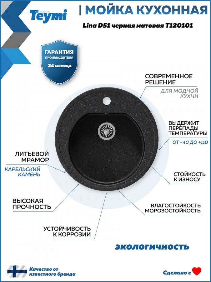 1. Мойка кухонная Teymi Lina D51, круглая, черная матовая T120101.