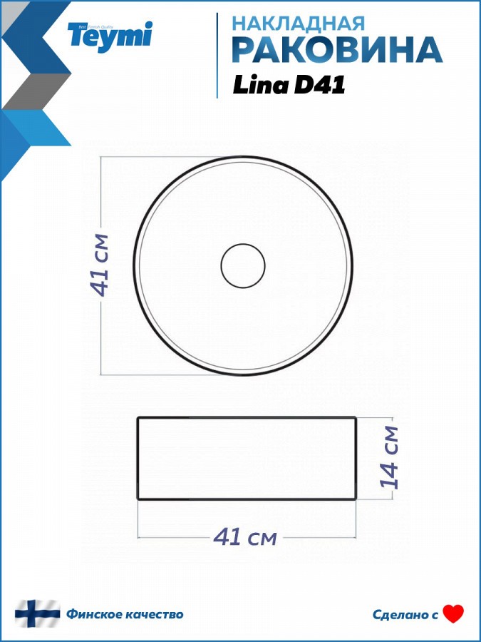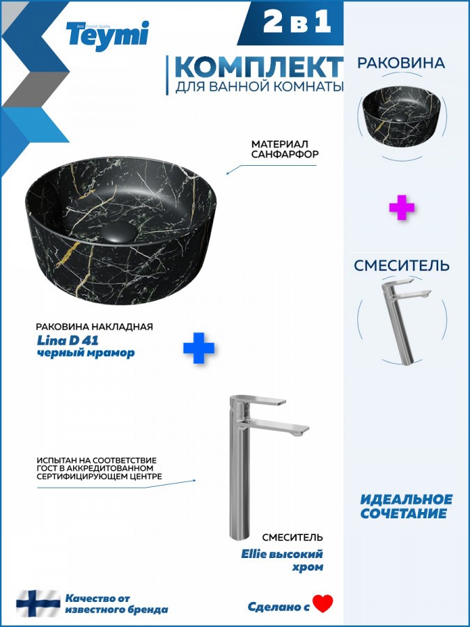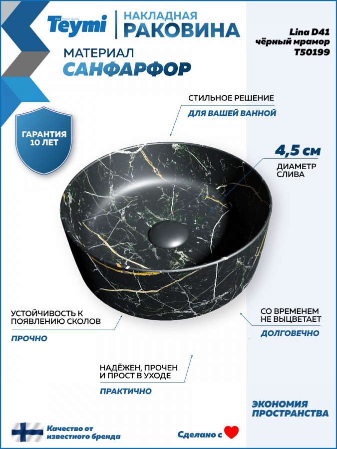 1. Раковина для ванной круглая накладная Teymi Lina D41 цвет черный мрамор.