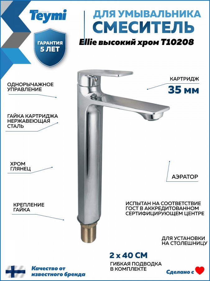 2. Смеситель для раковины высокий хром Teymi Ellie.