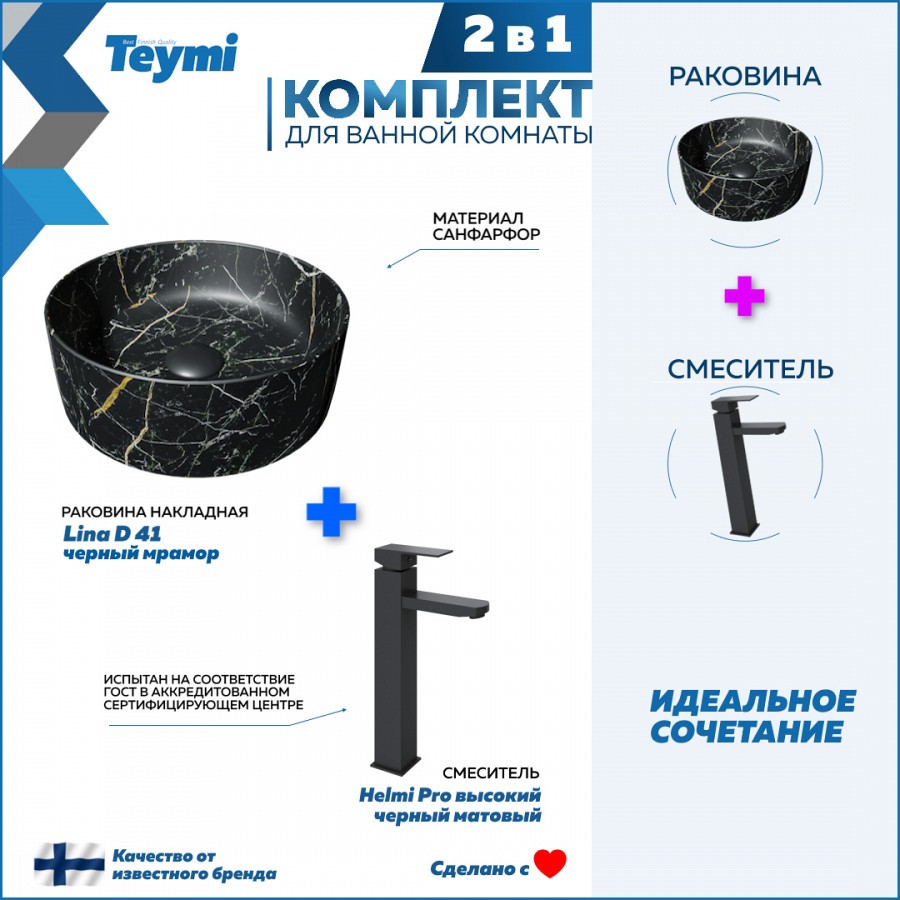 1. Раковина для ванной круглая накладная Teymi Lina D41 цвет черный мрамор.