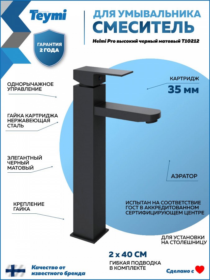 2. Смеситель для раковины высокий черный матовый Teymi Helmi Pro.