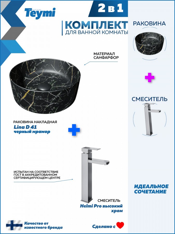 1. Раковина для ванной круглая накладная Teymi Lina D41 цвет черный мрамор.