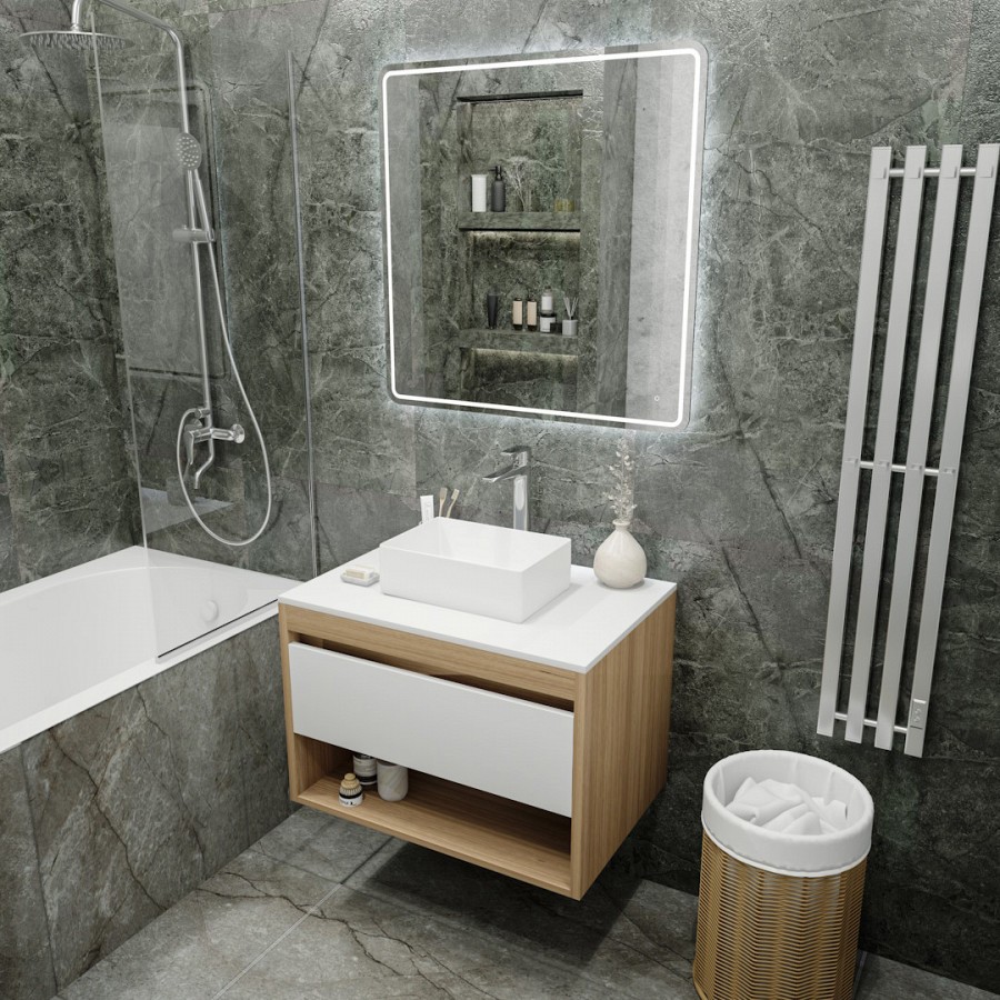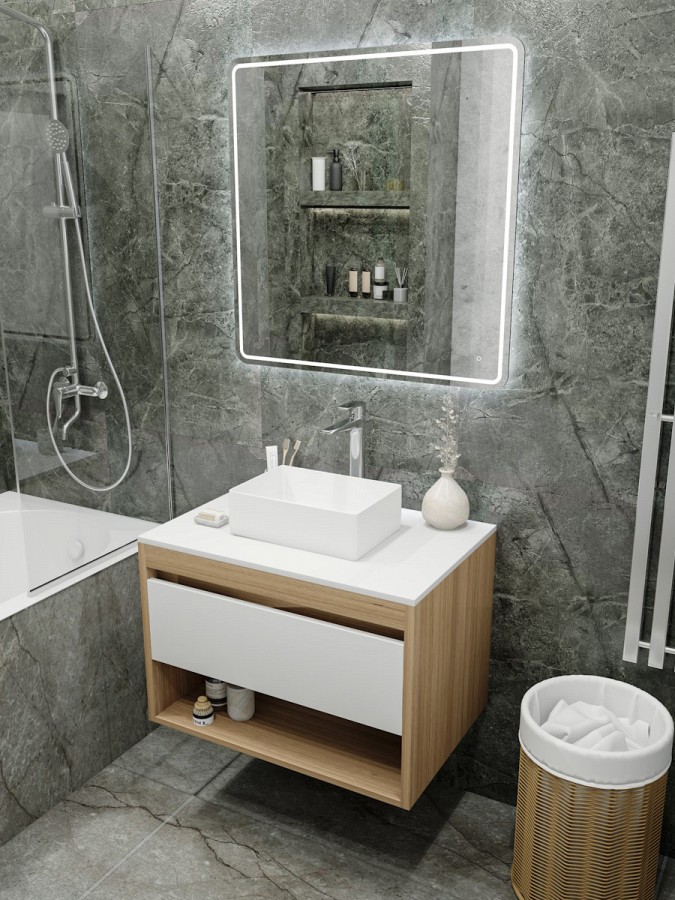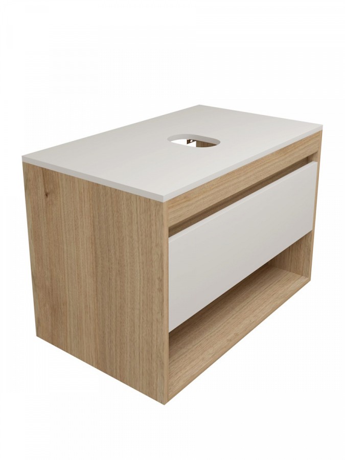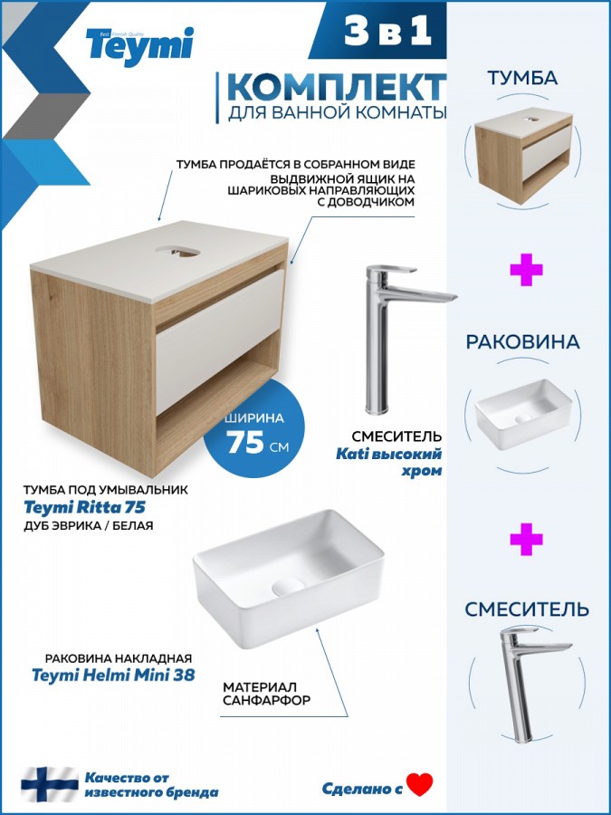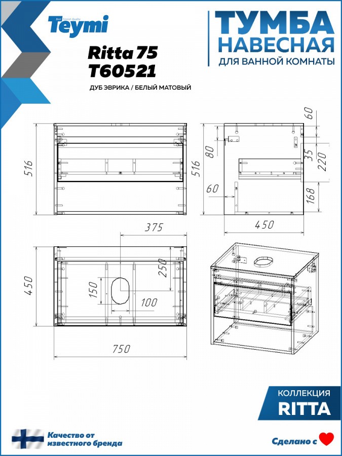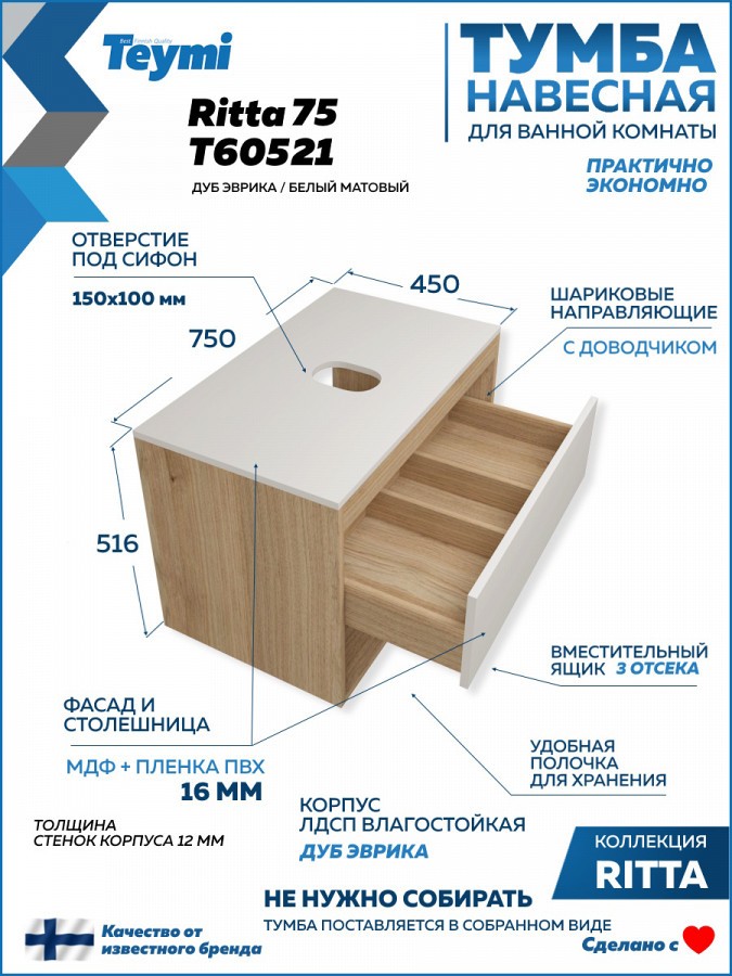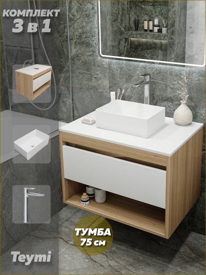 1. Тумба подвесная Teymi Ritta 75, ящик с доводчиком, цвет дуб эврика/белый матовый.