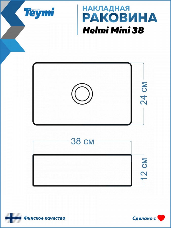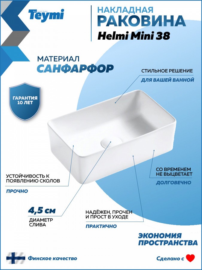 2. Раковина накладная Teymi Helmi Mini 38 artceramic, белая.