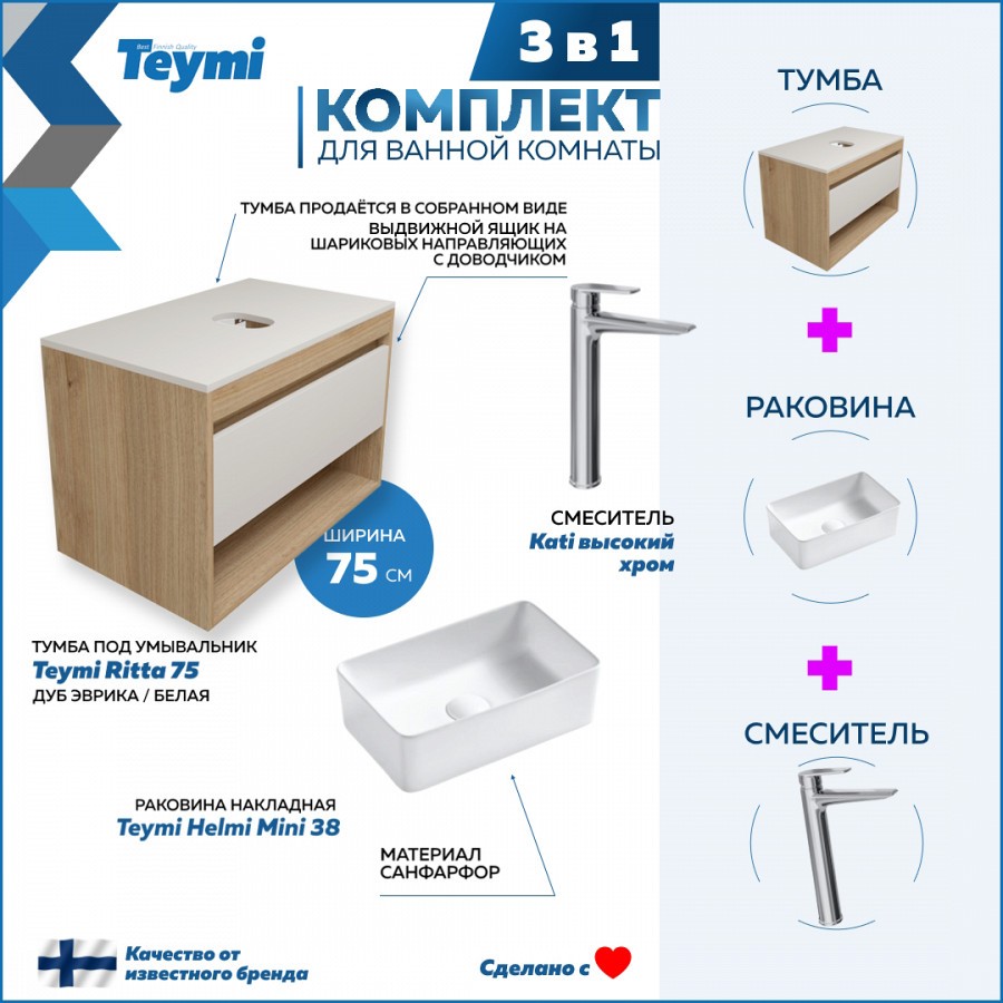 3. Смеситель для раковины Teymi Kati высокий, хром.