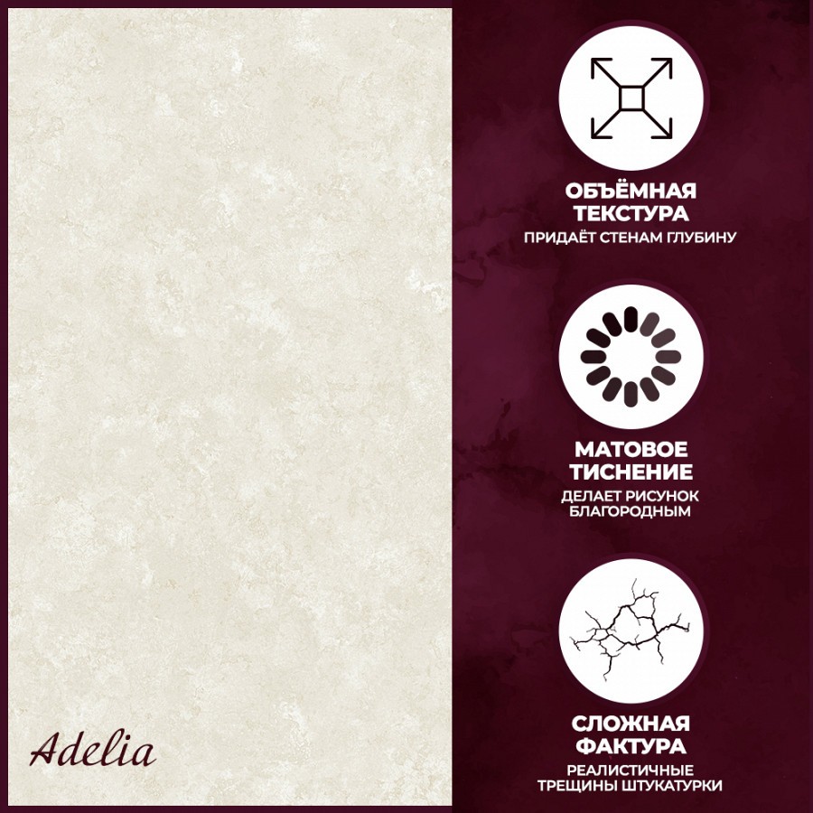 <div>«Adelia» — новый шикарнейший дизайн в виде классических дамасков с перламутровым отливом под слоем старинной обветшалой штукатурки. <br /> Рисунок еле виднеется, пробиваясь сквозь бетонную поверхность. <br /> Будто сотни лет назад некие королевские покои сменились на каменные джунгли и оголили истинную историю этого места — зрелище поистине потрясающее!<br /> Сплошное нанесение перламутра даёт разнообразный визуальный эффект на полотне благодаря матовому тиснению на бэкграунде и глянцевому на дамаске, что делает дизайн более объёмным и реалистичным.<br /> Ещё одной особенностью коллекции является нестандартное нанесение глиттера: вместо основного элемента мы подчеркнули трещины штукатурки, получив в итоге сложную и интересную фактуру полотна.<br /> Колористики максимально природных оттенков: от цвета слоновой кости и светлого бежа до глубокого серого и темного черно-графитового с металлизированным дамаском.<br /> Коллекция «Adelia» выполнена в незаурядном классическом стиле в современной интерпретации с элементами лофта! Она впишется в любой интерьер спальни, гостиной или прихожей, выполненный в трендовых направлениях наших дней.</div>