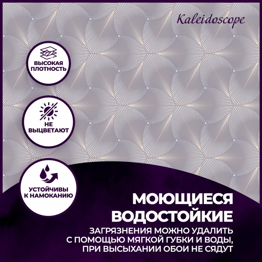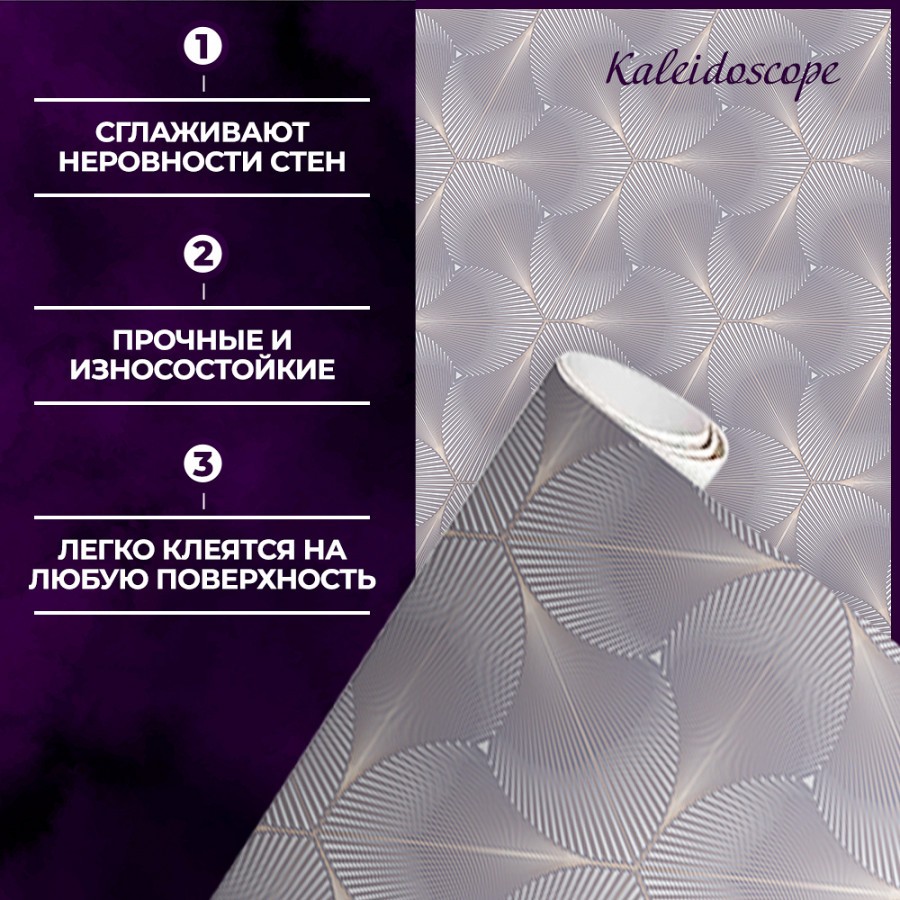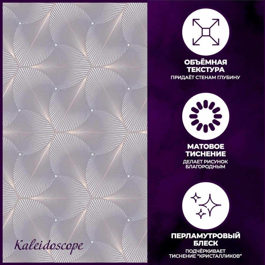 <div>Новая коллекция «Kaleidoscope» однозначно поразит вас своей неординарностью и многогранностью!<br /> Ее необычный дизайн заключается в том, что геометрический принт в виде абстрактных лепестков каждый раз складывается в новую композицию и смотрится абсолютно по-разному в зависимости от колористики! Поэтому можно смело сказать, что у каждой расцветки свой дизайн! <br /> Цвета в коллекции тоже необычные: есть коммерческие варианты, такие как стальной или молочный. Есть оттенки более нетривиальные: сочетание темного графита с золотом, жемчужный, пыльно-синий или тёмный серый с коричневыми прожилками.<br /> Перламутр подчёркивает тиснение «кристалликов», которые изящно играют на свету.<br /> Коллекция «Kaleidoscope» может украсить любой интерьер в стиле ар-деко и будет прекрасно смотреться в спальне, гостиной или прихожей.</div>