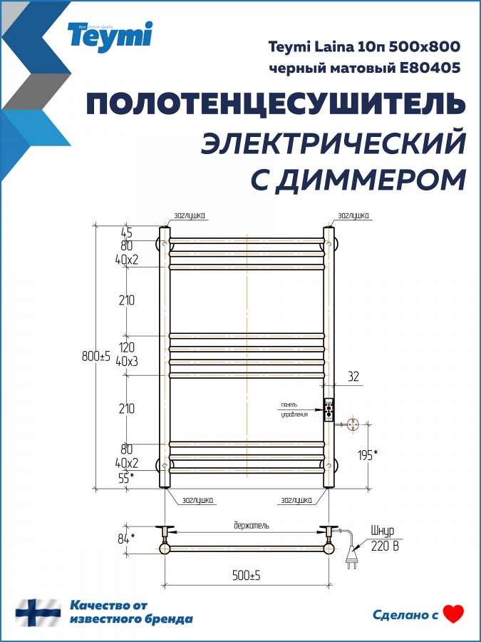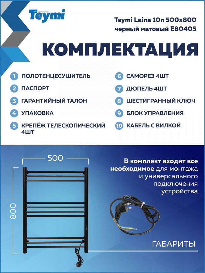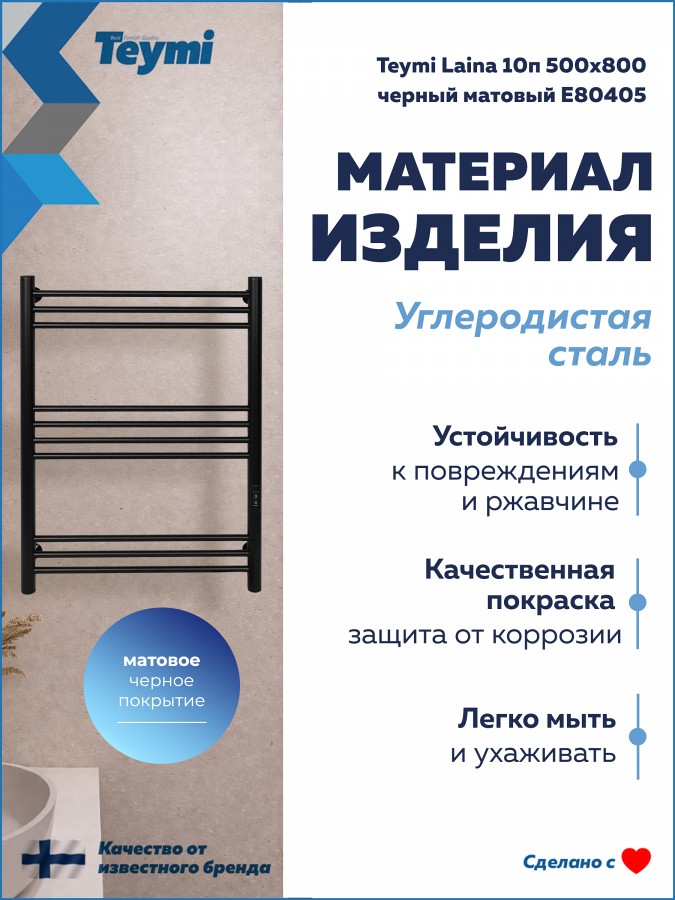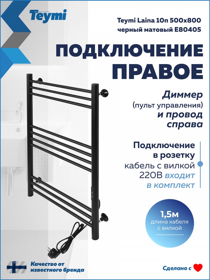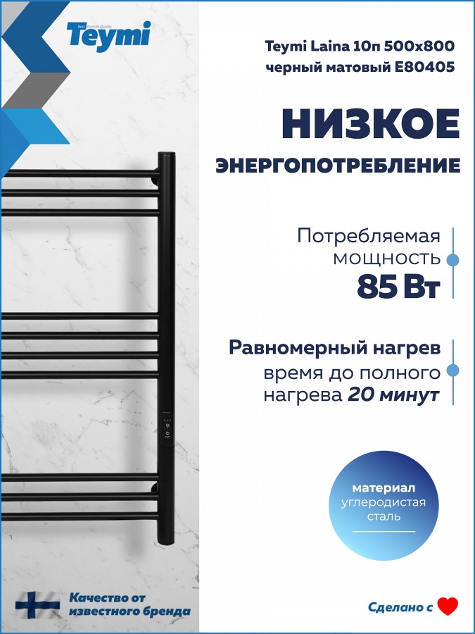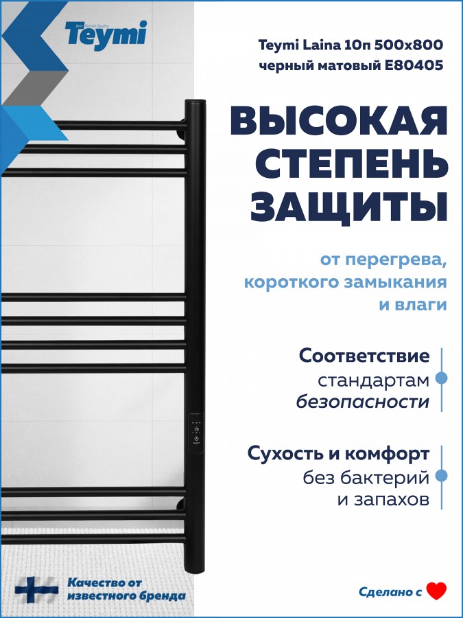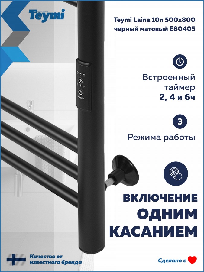 Электрический полотенцесушитель Teymi Laina E80405 в глубоком черном матовом цвете — это функциональное украшение современной ванной комнаты. Сочетая в себе строгую геометрию скандинавского стиля и передовые технологии управления, эта модель с 10 перекладинами обеспечит идеальную сухость текстиля и комфортный микроклимат в помещении.