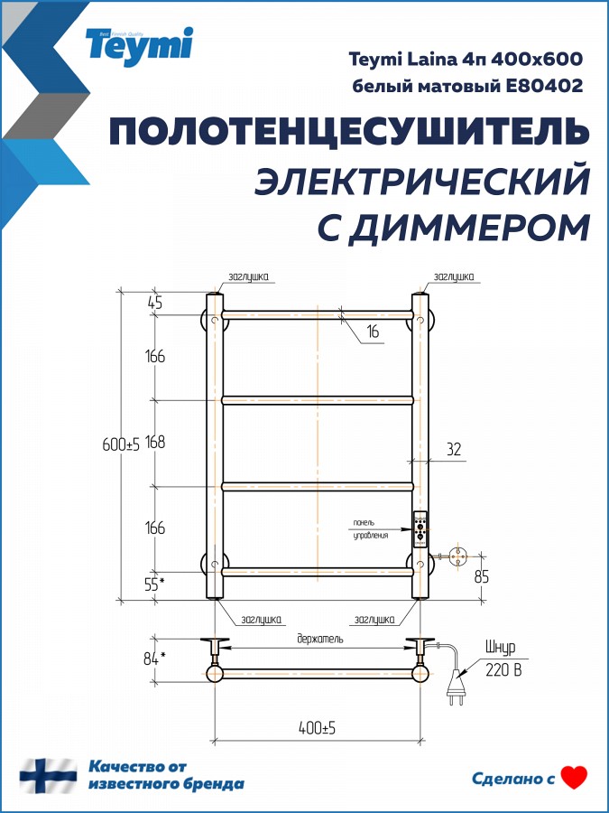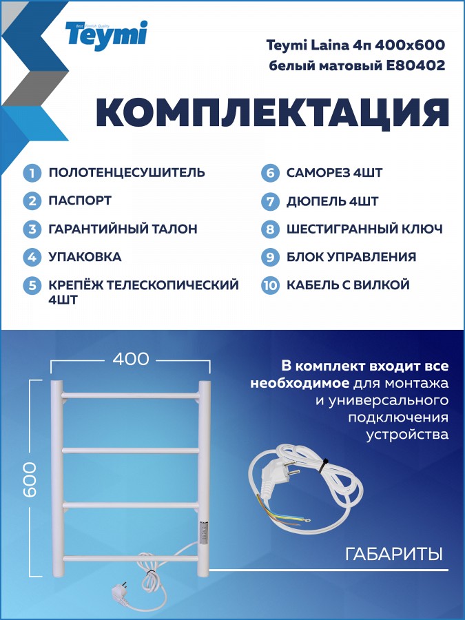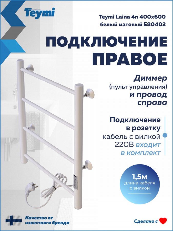 Электрический полотенцесушитель Teymi Laina E80402 в элегантном белом матовом исполнении — это безупречное сочетание эстетики скандинавского дизайна и современных технологий. Компактная и стильная модель не только обеспечит идеальную сухость ваших полотенец, но и поможет поддерживать здоровый микроклимат, предотвращая появление сырости в ванной комнате.