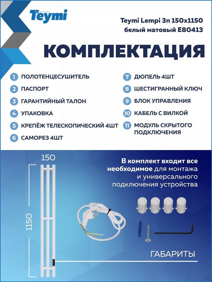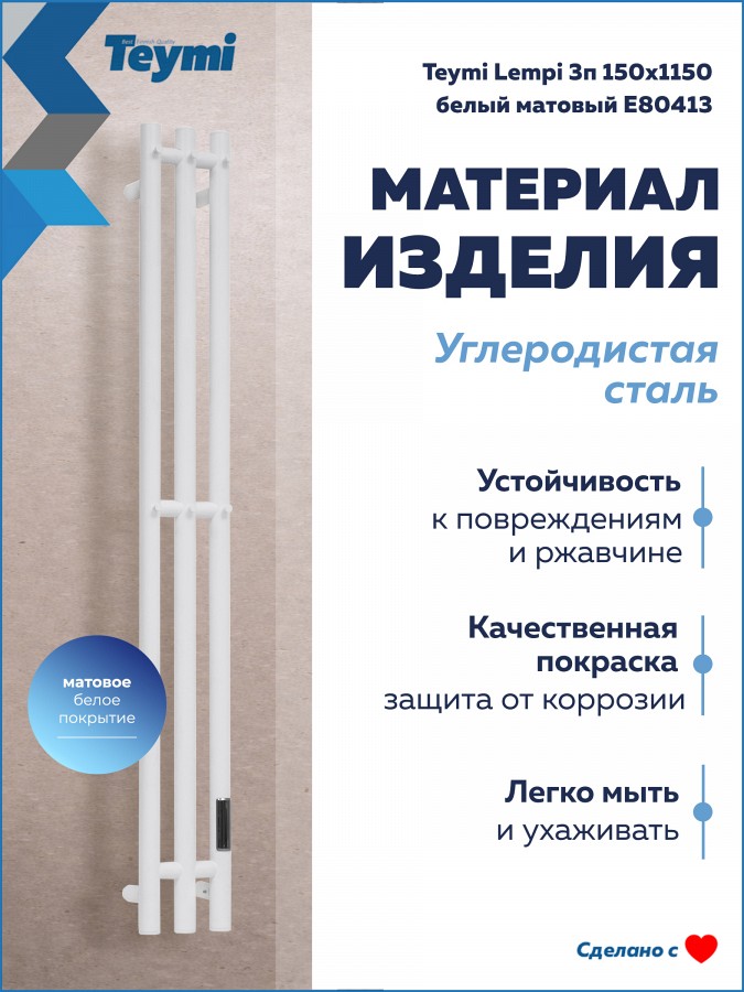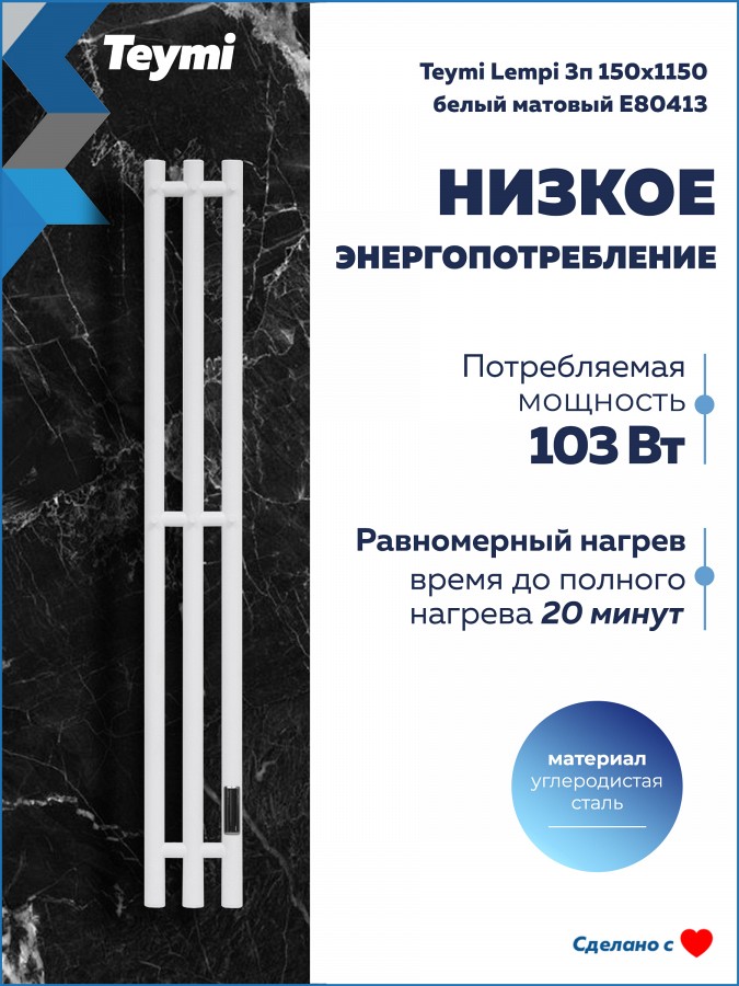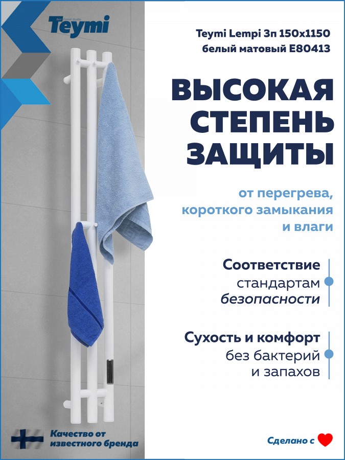 Электрический полотенцесушитель Teymi Lempi E80413 в формате вертикальной I-образной колонны — это воплощение архитектурного минимализма и высокой функциональности. Его компактный силуэт в благородном белом матовом цвете визуально расширяет пространство, превращая привычный бытовой прибор в стильный элемент современного интерьера.