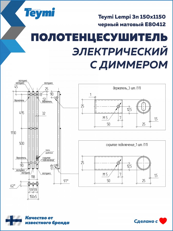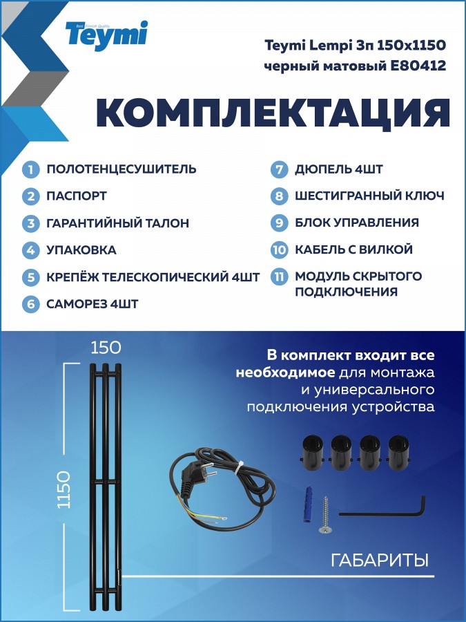 Устройство поставляется в полной готовности к работе: полотенцесушитель, модуль скрытого подключения, кабель с вилкой, 4 телескопических крепления и необходимый набор метизов.