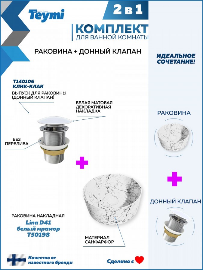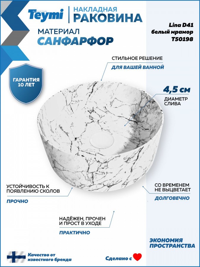 1. Раковина для ванной круглая накладная Teymi Lina D41 цвет белый мрамор.