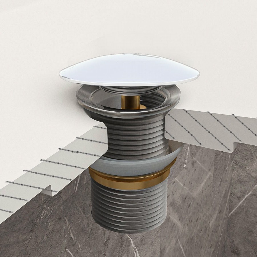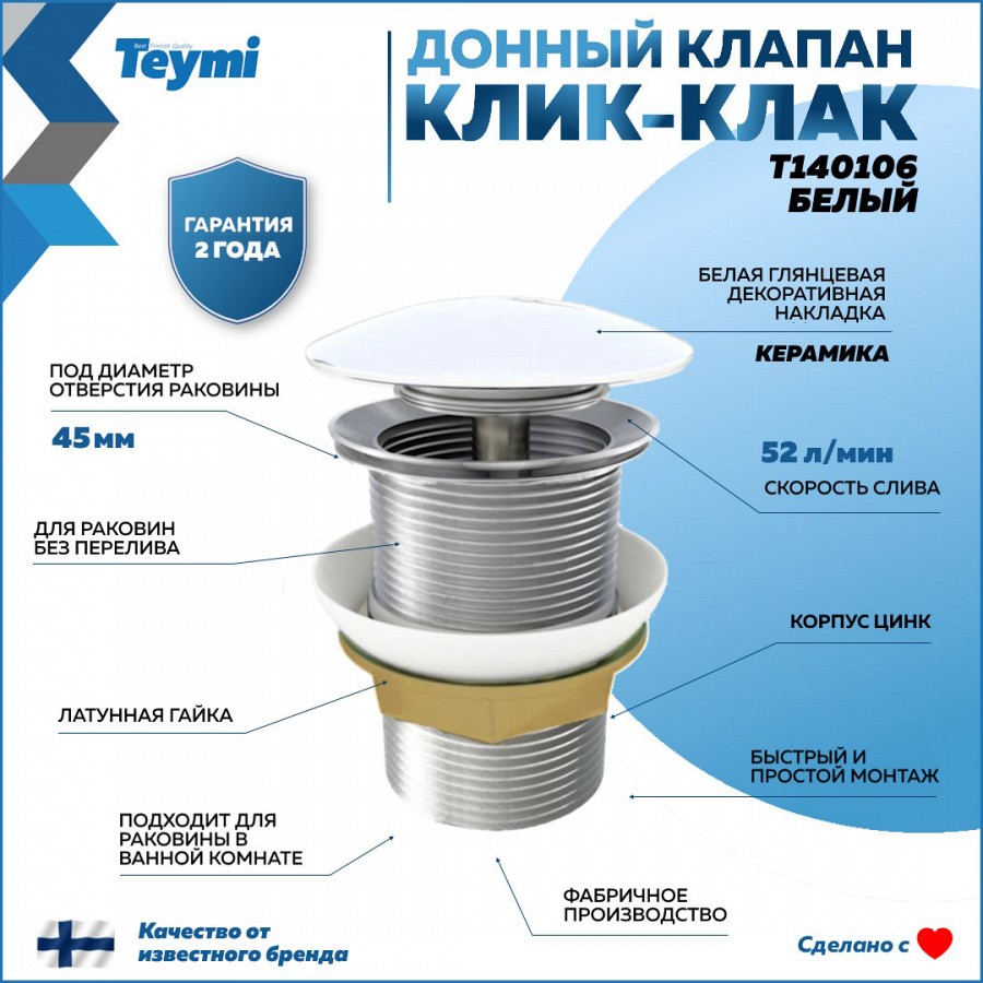 2. Донный клапан для раковины без перелива Teymi Solli белый крышка керамика.