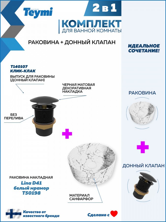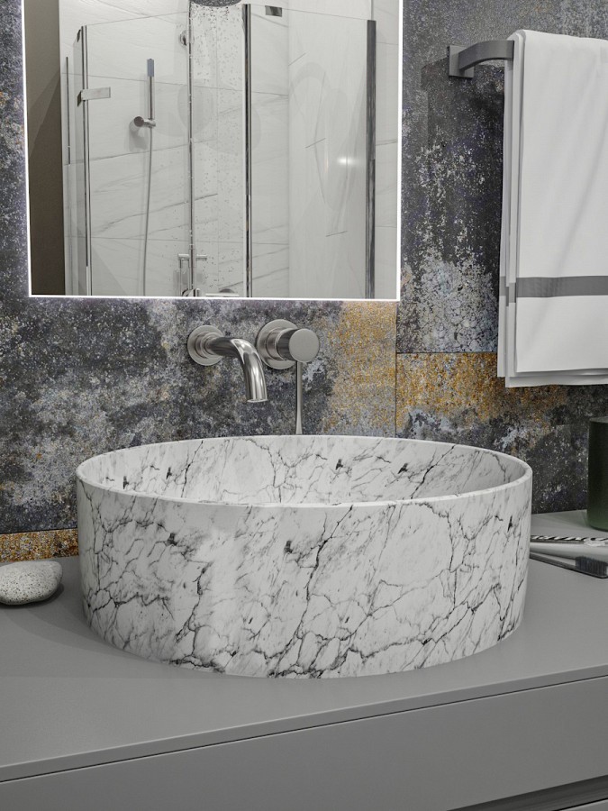 1. Раковина для ванной круглая накладная Teymi Lina D41 цвет белый мрамор.