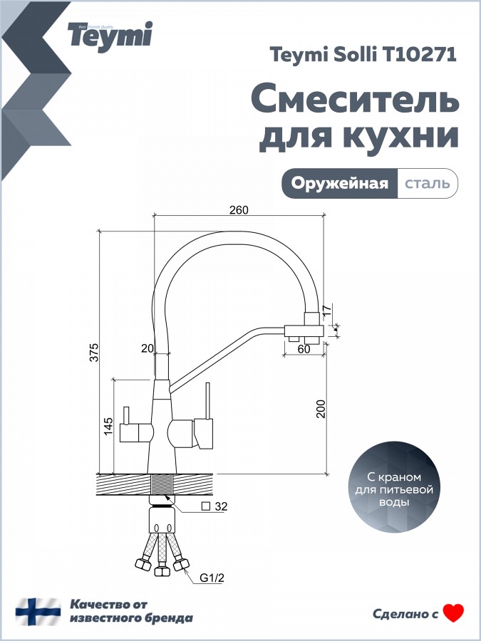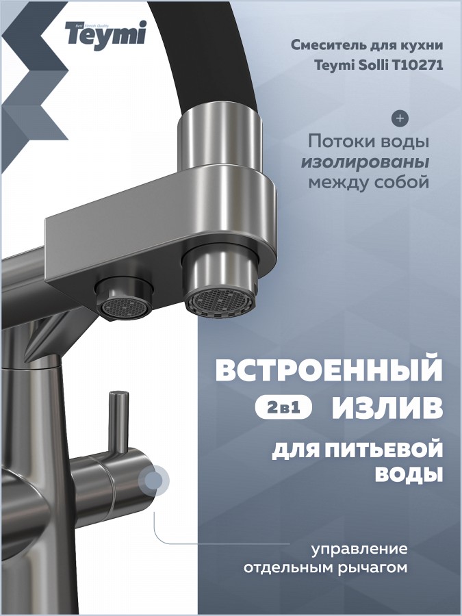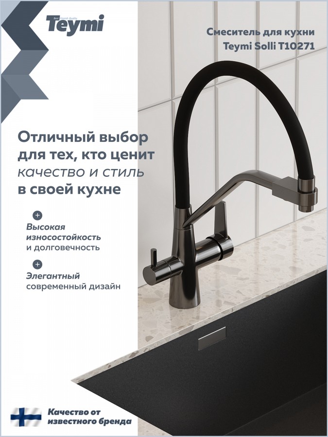 Teymi Solli T10271 — это надежный и стильный кухонный смеситель, объединяющий функциональность, практичность и финское качество.