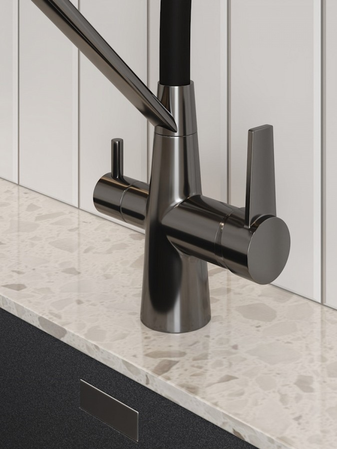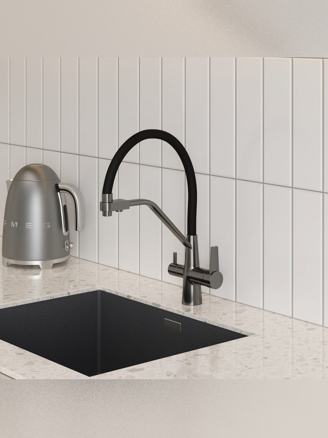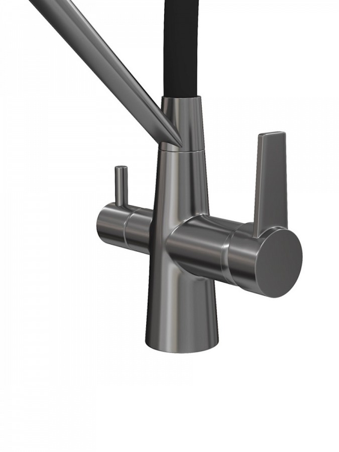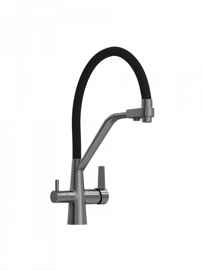 Главная особенность модели — система 2-в-1 для подачи питьевой воды. Потоки разделены и управляются отдельным рычагом, что позволяет пользоваться как обычной водой, так и фильтрованной без установки дополнительного крана. Такое решение не только экономит место на мойке, но и делает использование максимально удобным.
