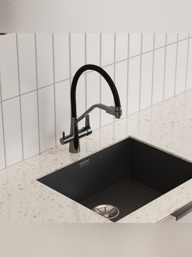 Смеситель устанавливается в одно отверстие и подходит для большинства моек. Современный дизайн модели гармонично вписывается в кухни различных стилей — от минимализма до лофта.