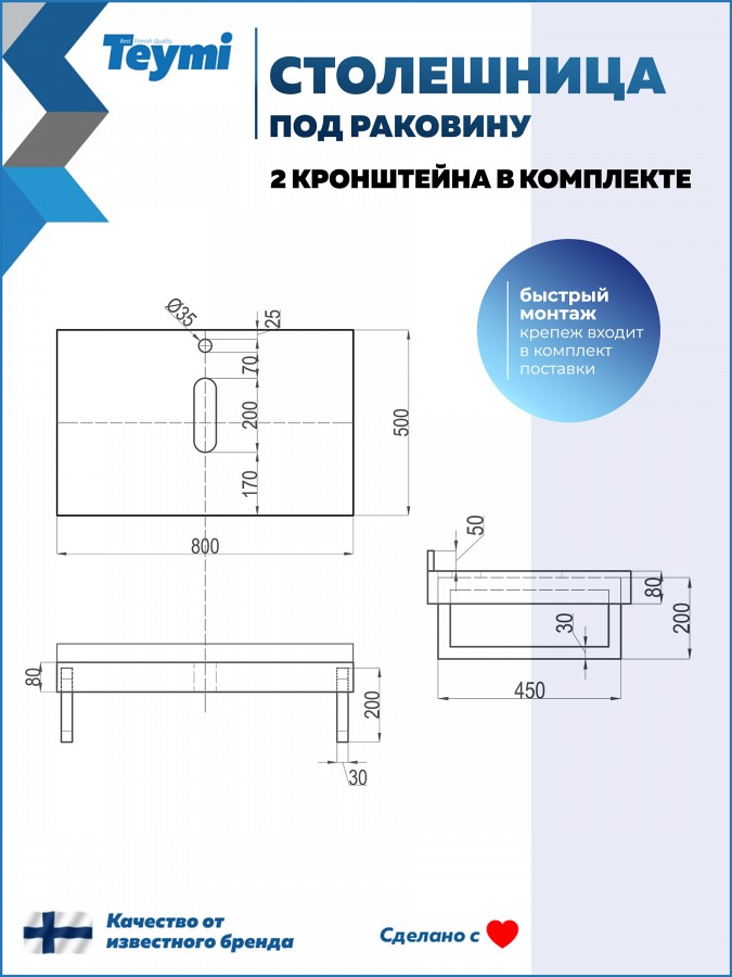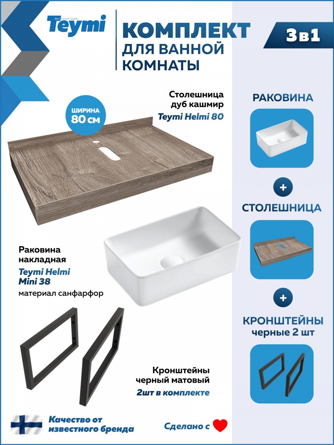 1. Столешница под раковину Teymi Helmi 80, керамогранитная, дуб кашмир;