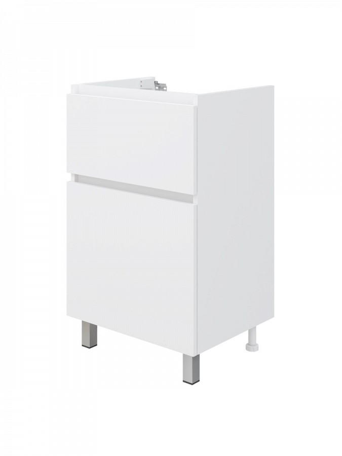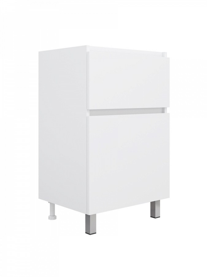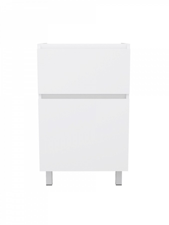 Тумба модели Laina 50 выполнена в прямоугольной форме и имеет оптимальные размеры: ширина — 503 мм, глубина — 460 мм, высота с ножками — 833 мм, высота ножек — 90 мм. Корпус изготовлен из прочного ЛДСП, фасадные панели — из МДФ с матовым покрытием ПВХ‑плёнкой. Белый цвет придаёт мебели сдержанный и аккуратный вид, подчёркивая современный стиль оформления ванной комнаты.